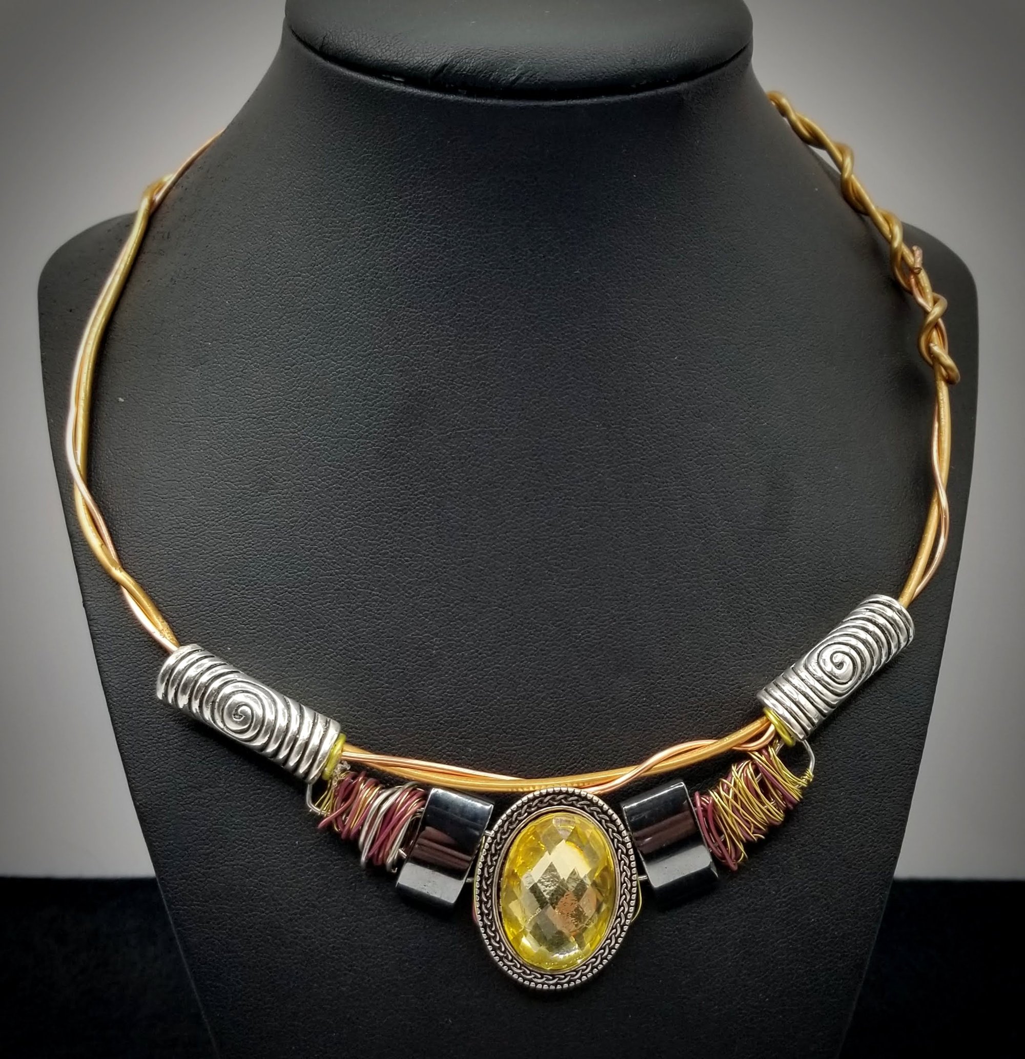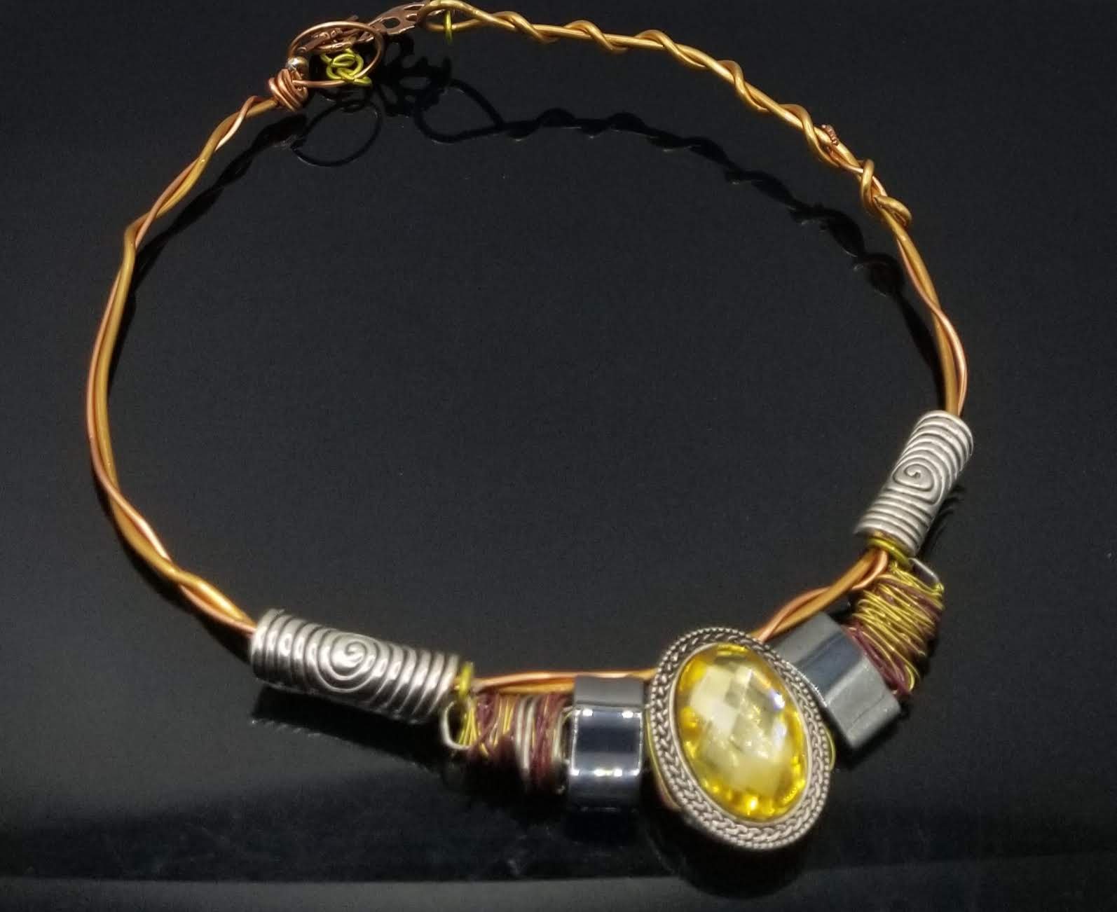 Item #900146- Wire wrap mix, Hematite and Silver metal deco accents. Faceted metal front. Rose leaf toggle clasp.