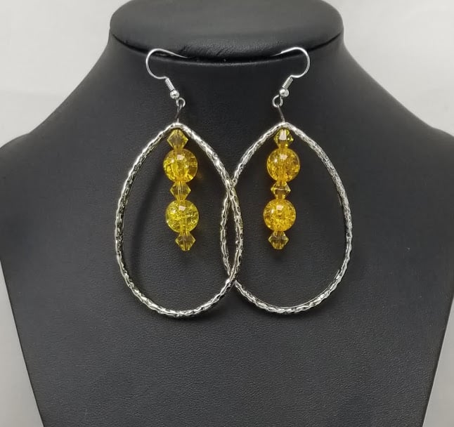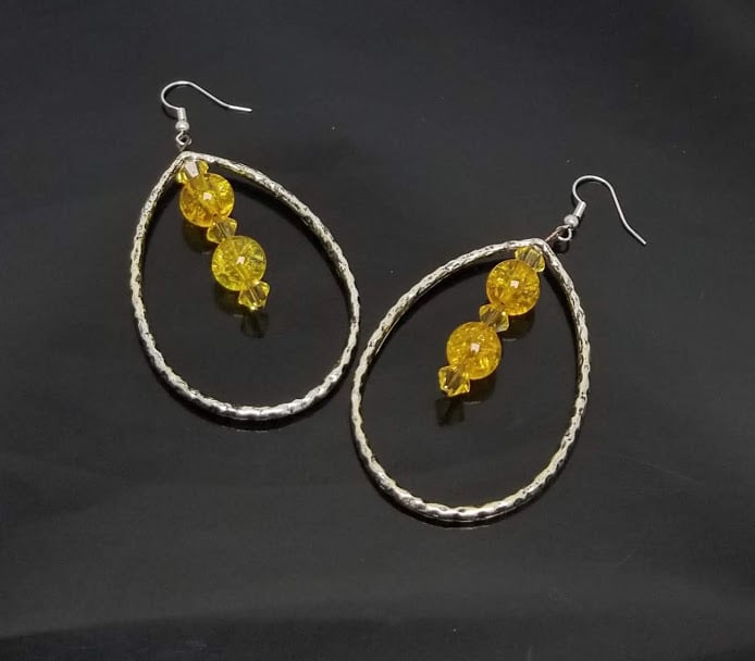 Item# 442221-3 inch- Open face hammer metal with Canary glass bead accents. Silver filled hooks (hypoallergenic)