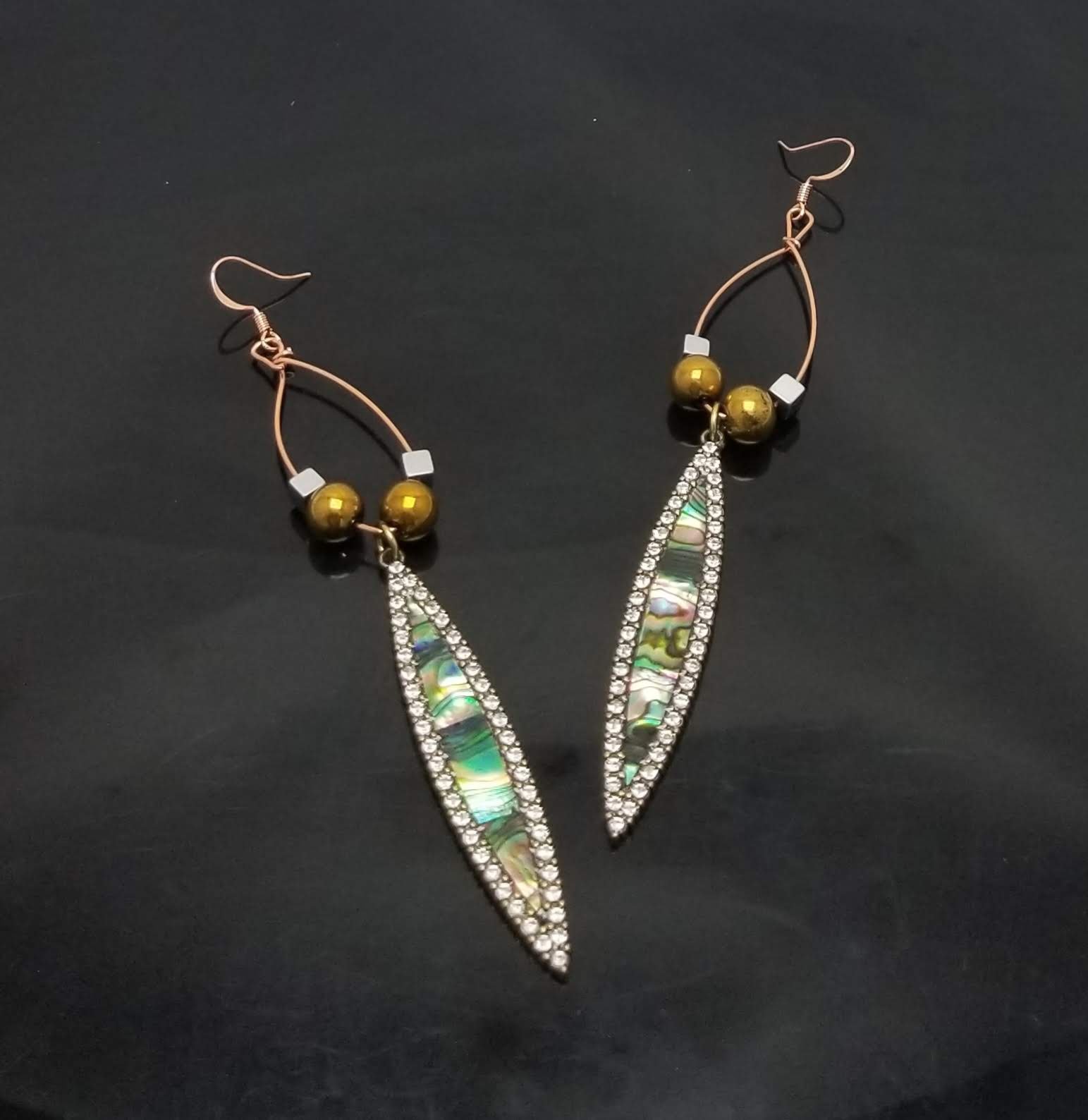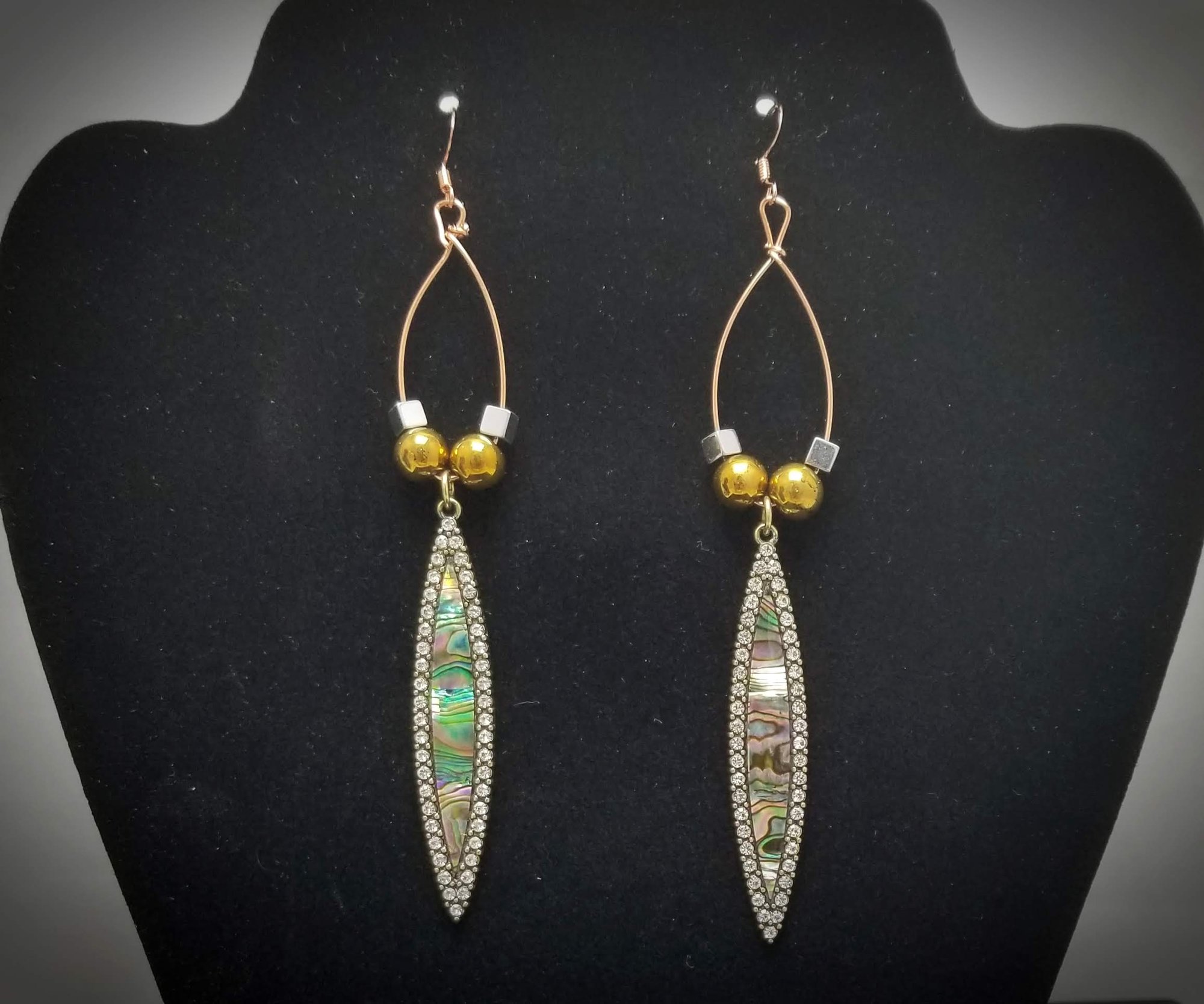 Item #806839-4.5 inch-Abalone stone accent drop, rose wire twist, mix bead accents. Rose flat hooks.