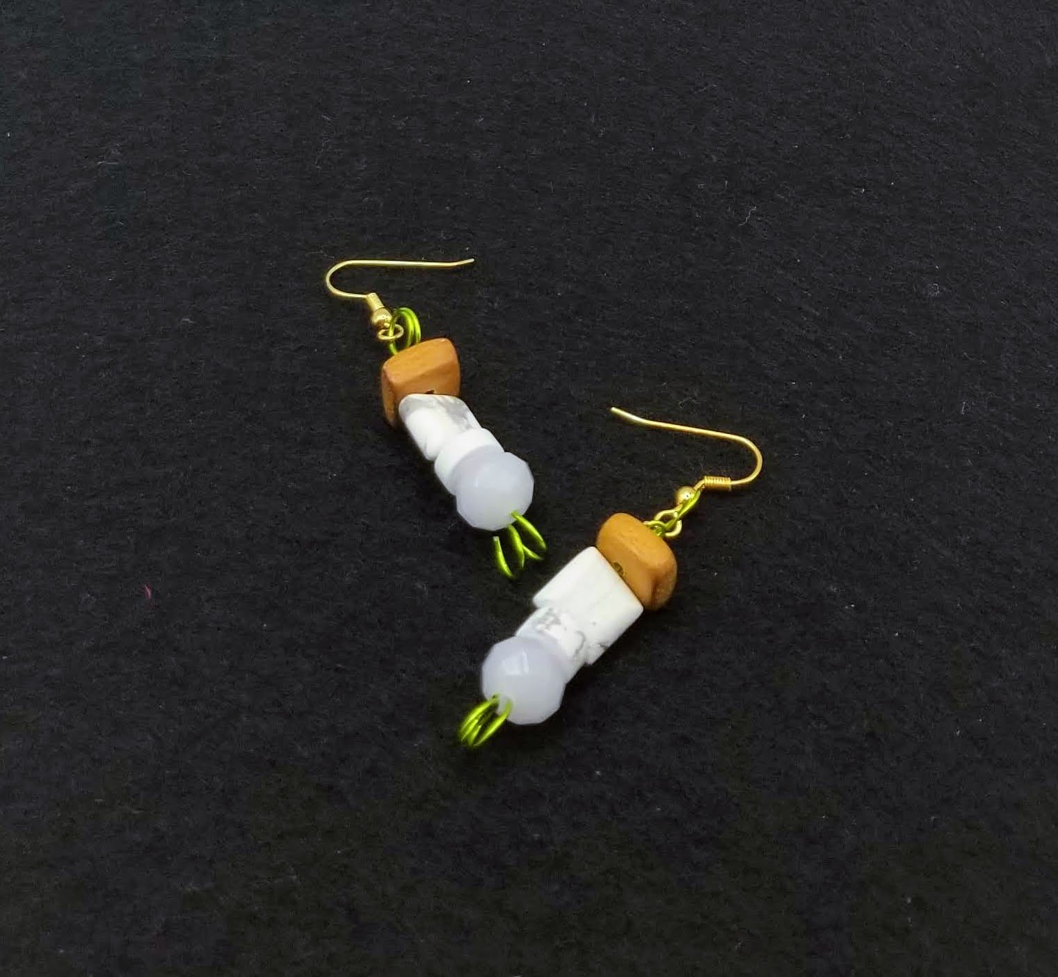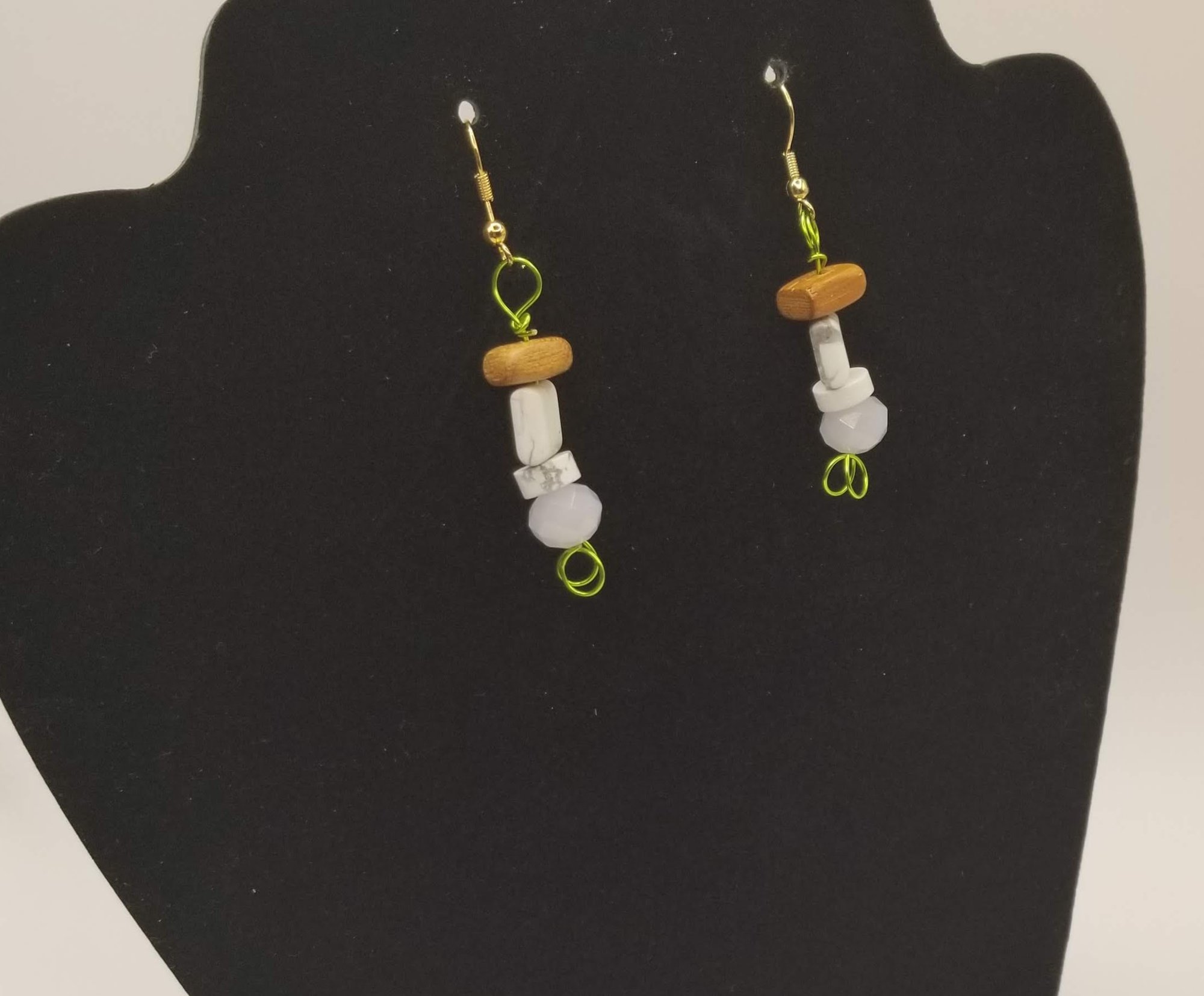 Item# 900664 - 2 inch Wood, Howlite, faceted frost rondella with color wire connect. Gold hooks.