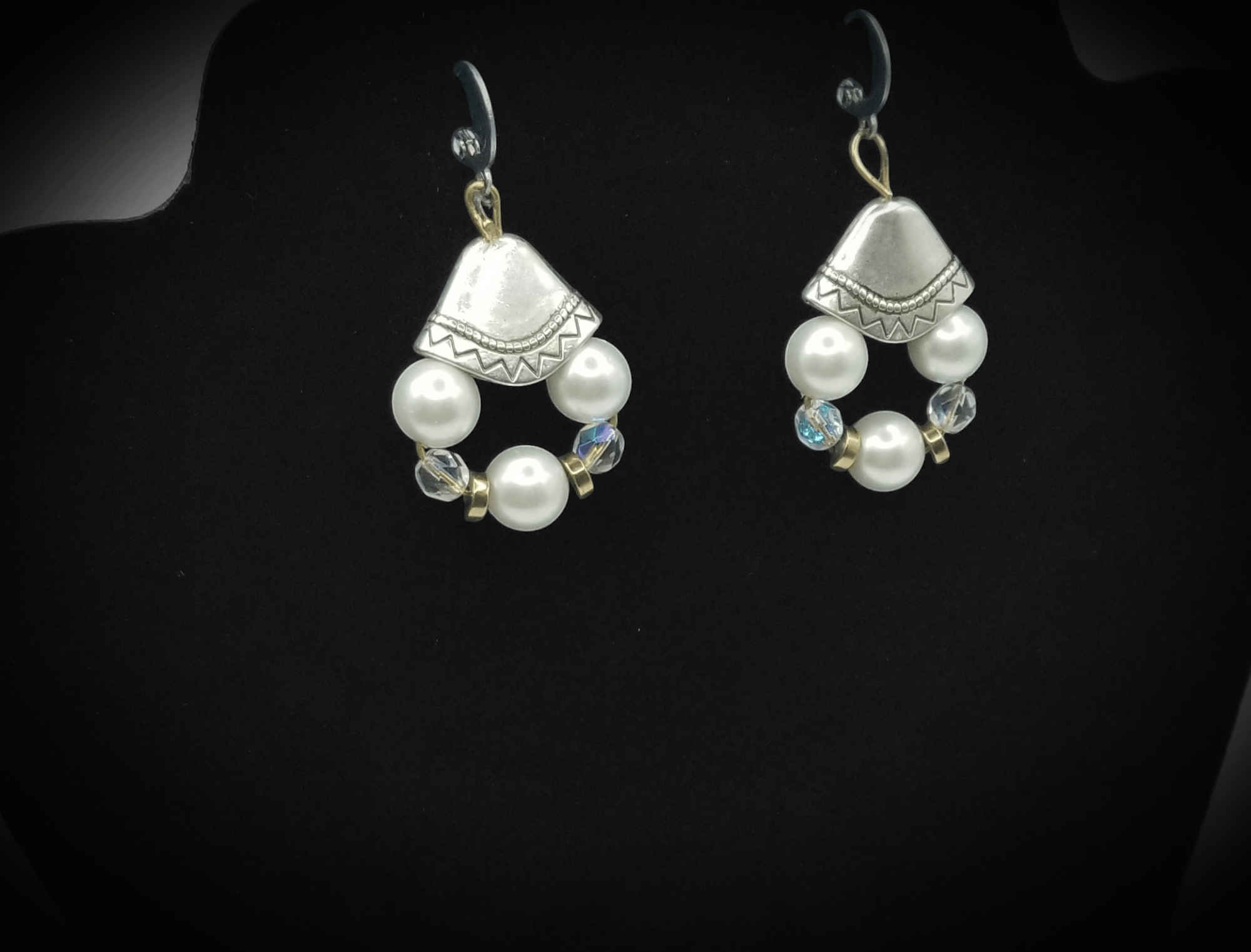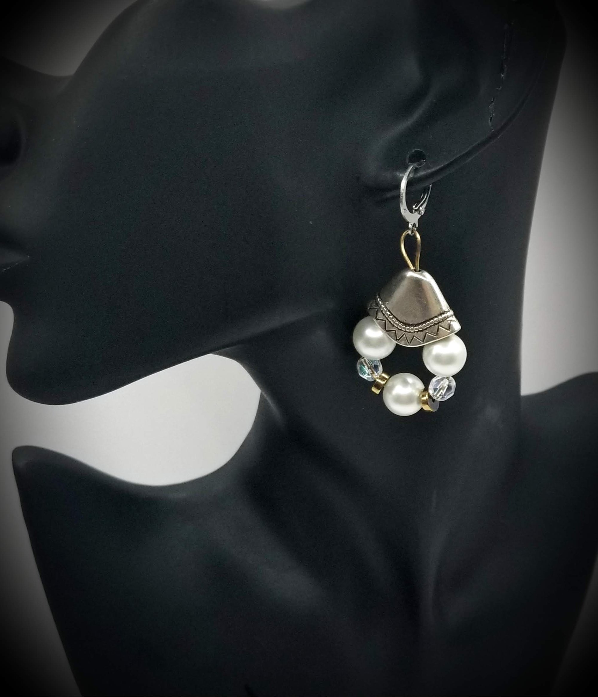 Item #912582 - 1.5 inch 3 Pearl paired with iridescent glass/gold metal mix, silver deco metal top accent. Stainless Steel round leaver backs.