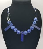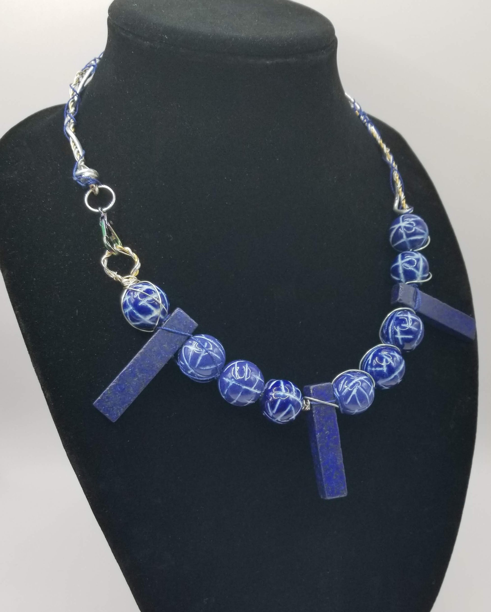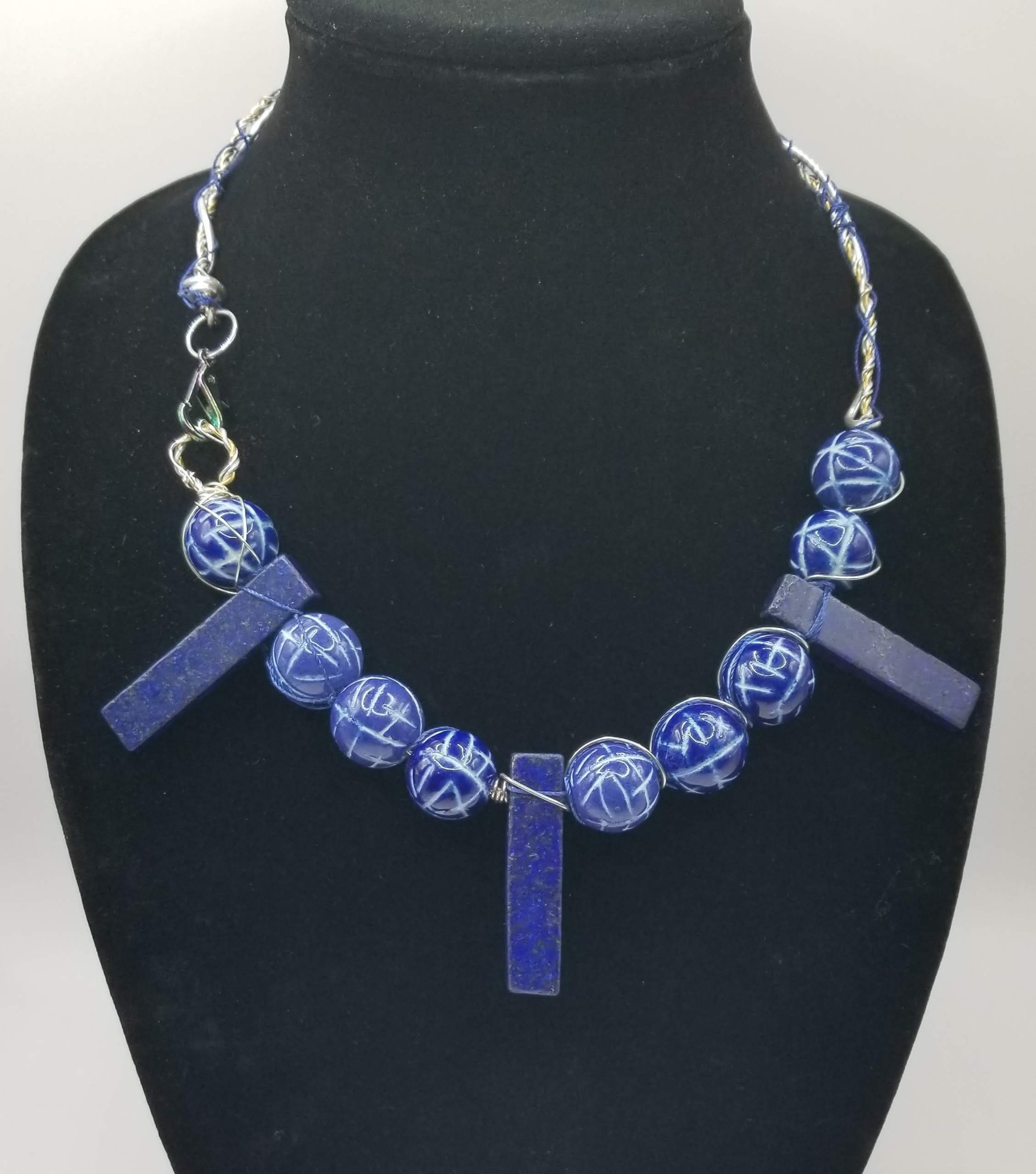 Item# 900173-19 inch- Intertwined wire, Blue stone mix. Iridescent jumbo lobster claw side accent.