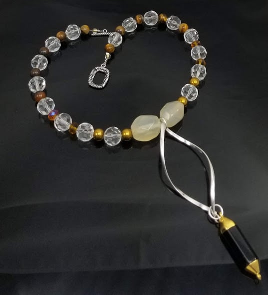 4 inch Silver Twirl , Onyx Gold tip drop. Silver metal toggle clasp.