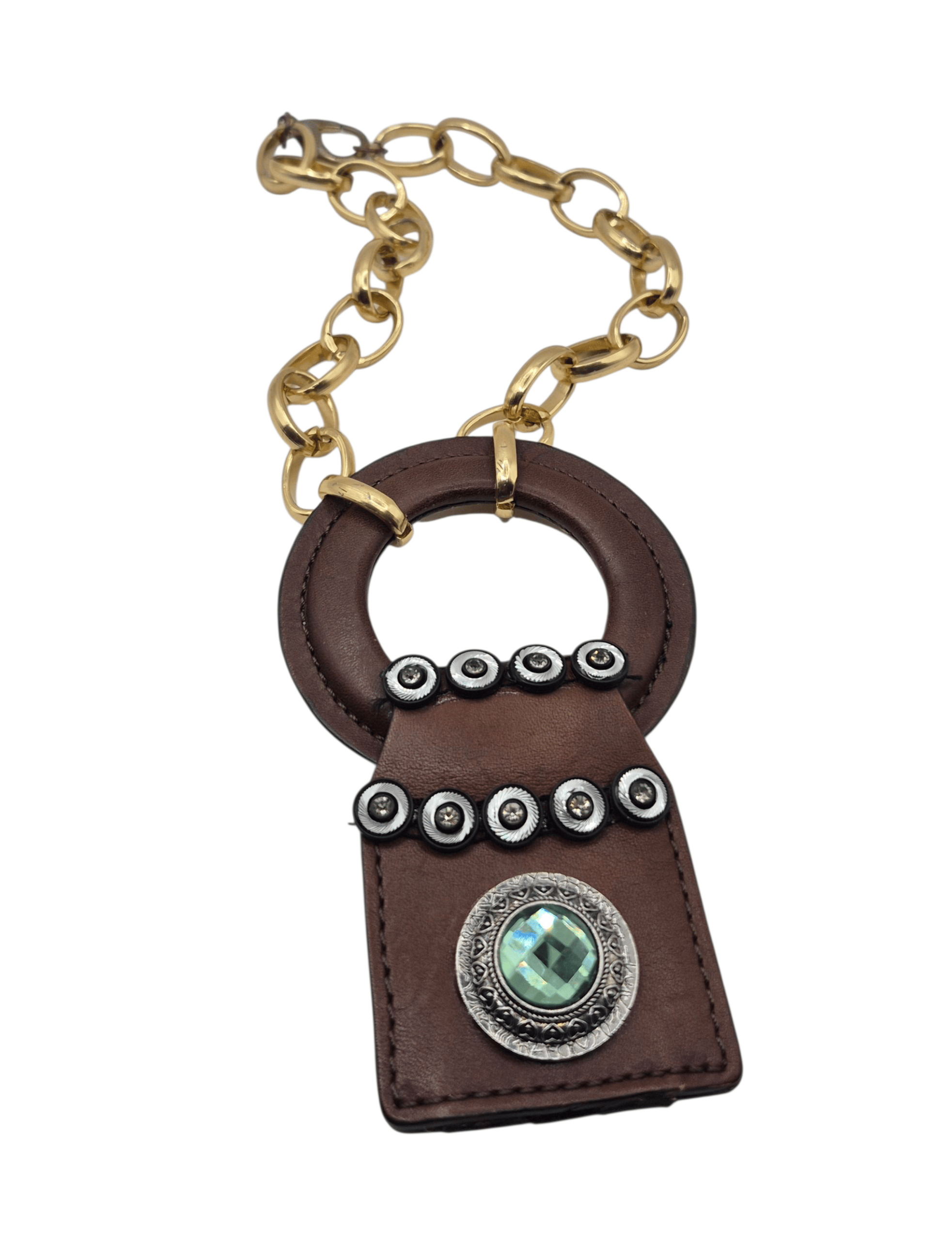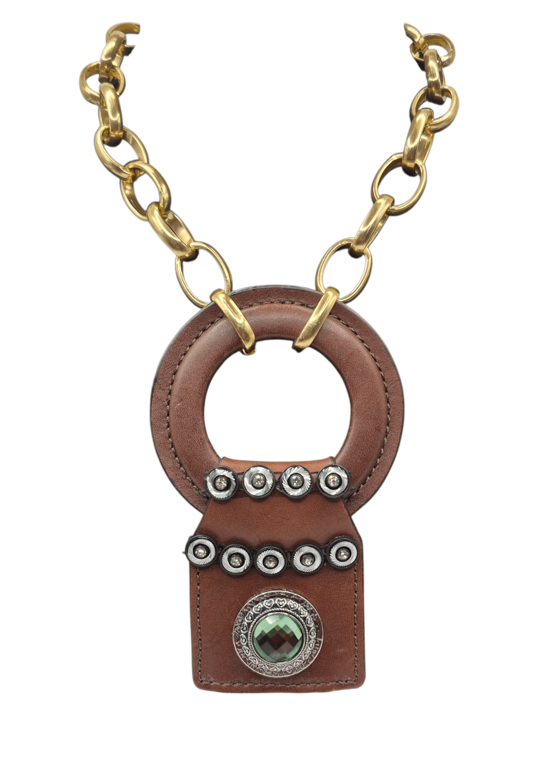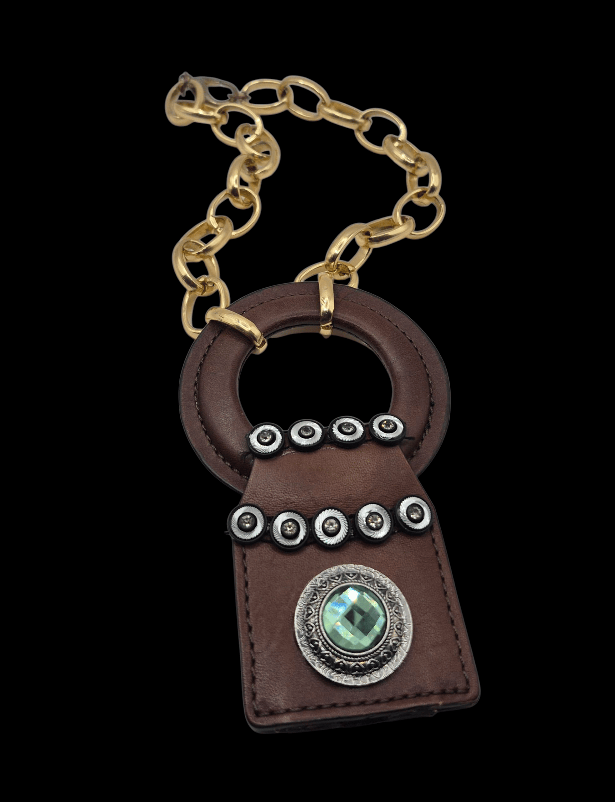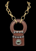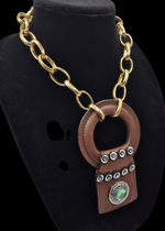 Item #200107 - 19inch/5inch (drop) Open faced deco leather drop, jumbo gold metal back chain/lobster claw.