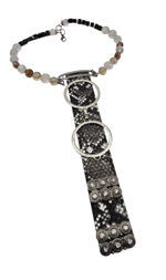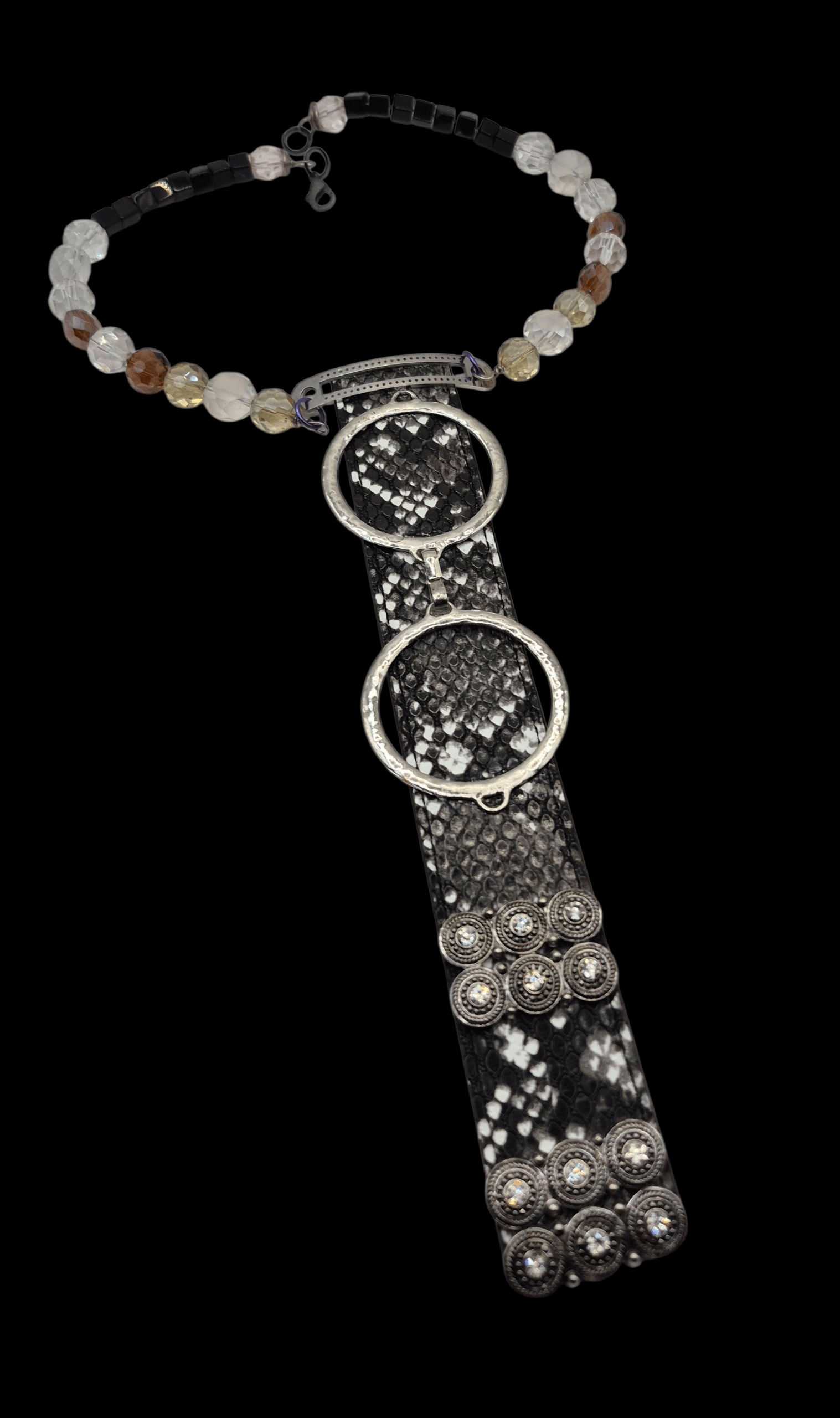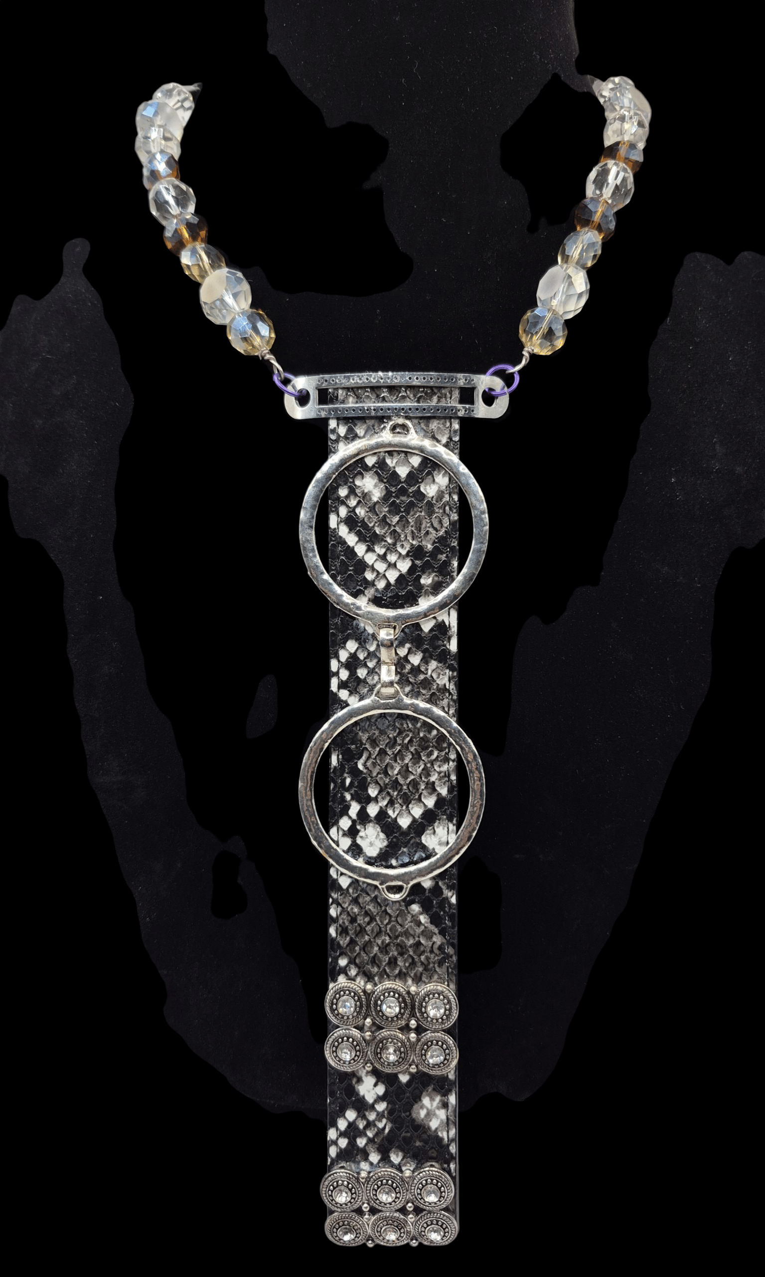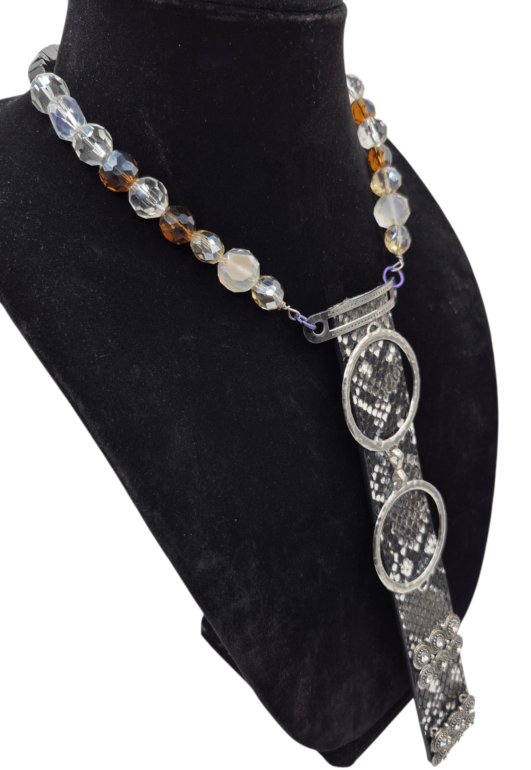 Item #912684 -17.5 inch/8.5 inch (drop) - Snake print faux leather back with deco metal front accents. Faceted glass with jet square back accents. Brush metal lobster claw clasp.