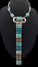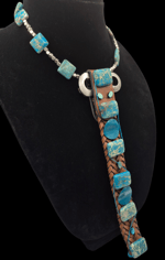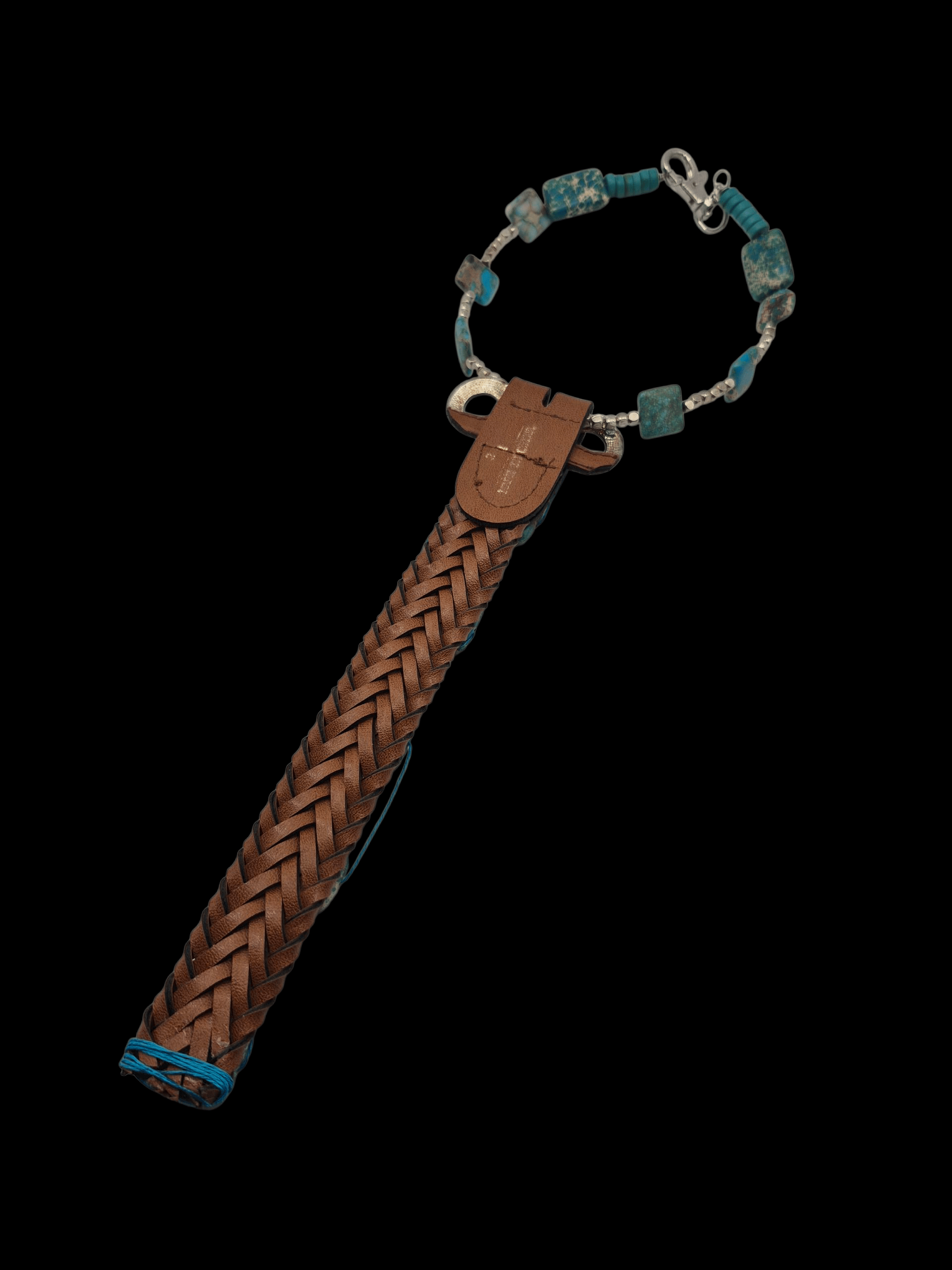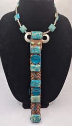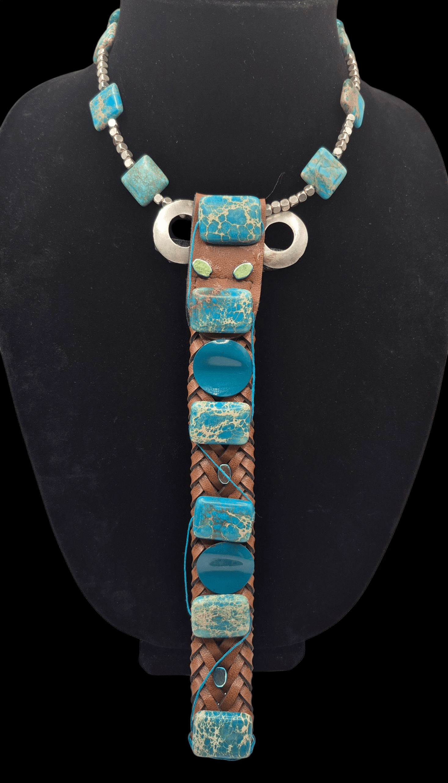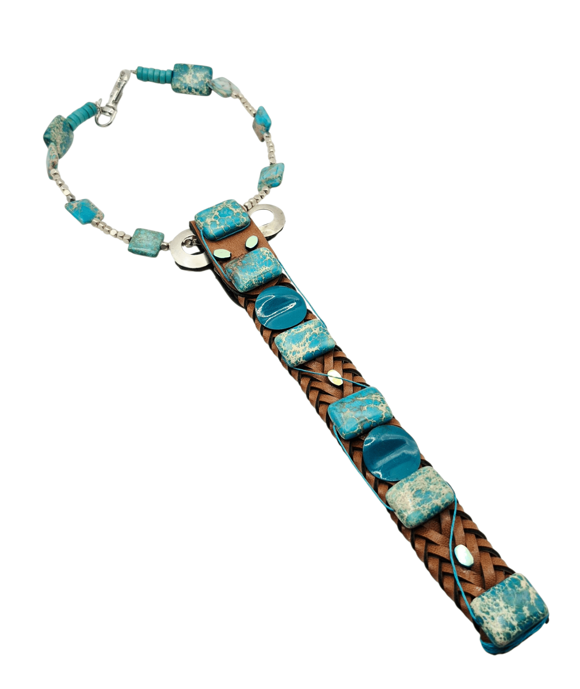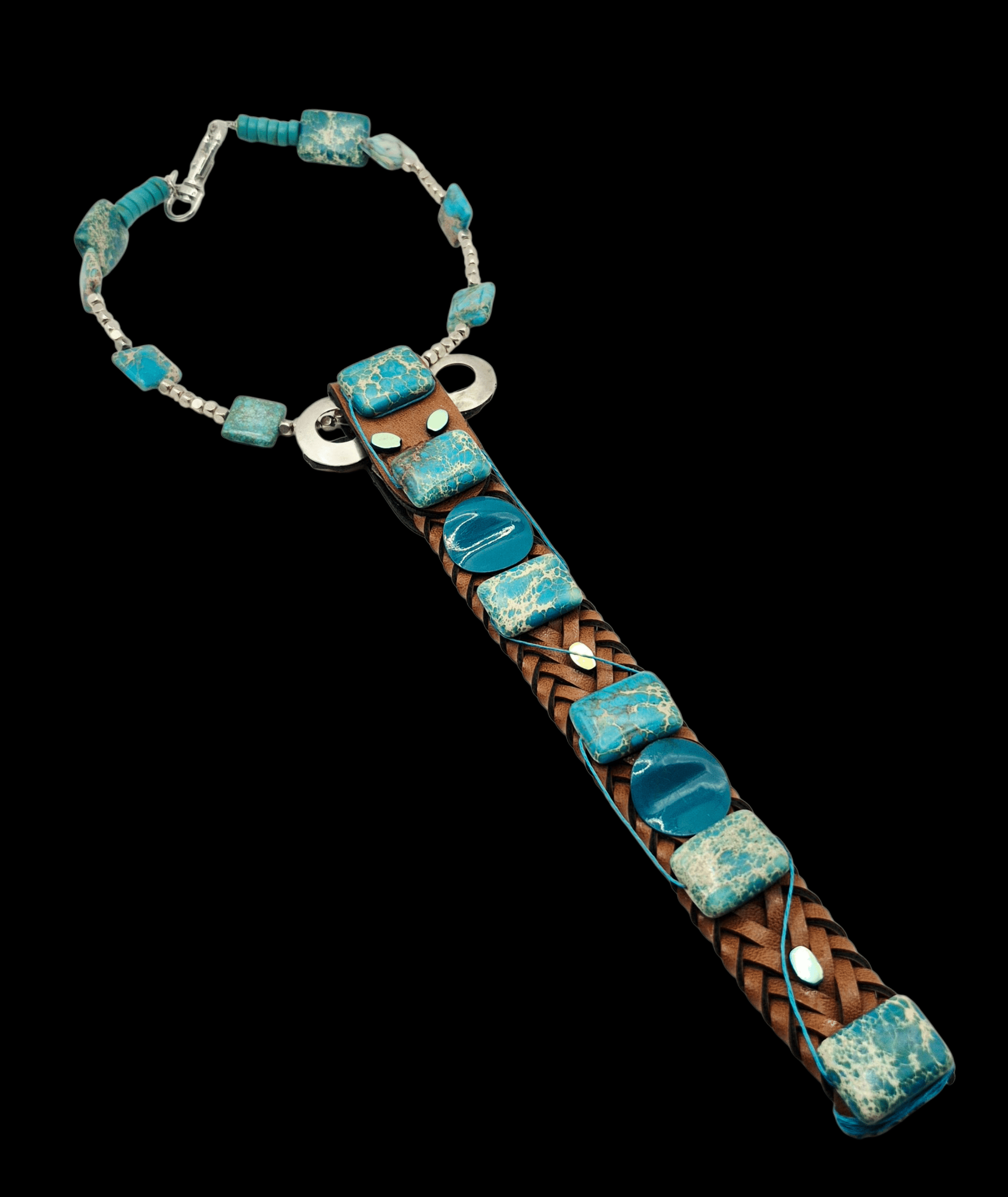 Item #200181- 16 inch/9 inch (drop) - Leather weave with multi Turquoise front accents, metal top connect,silver mix paired with Turquoise flat back accents. Jumbo silver clasp.