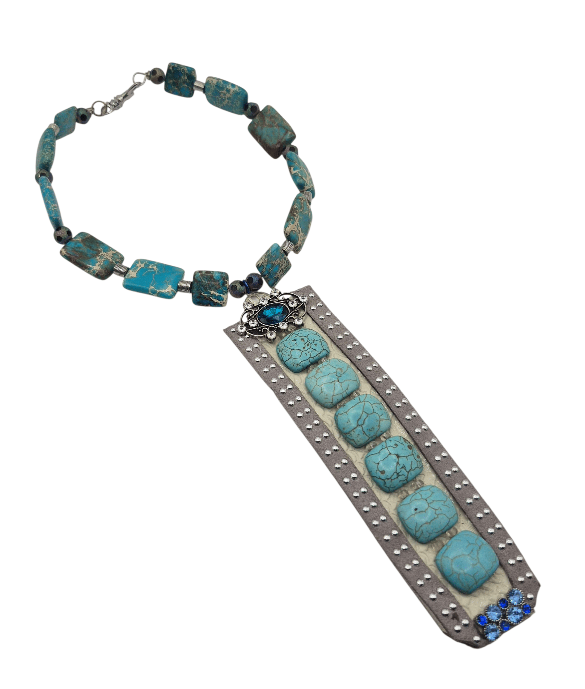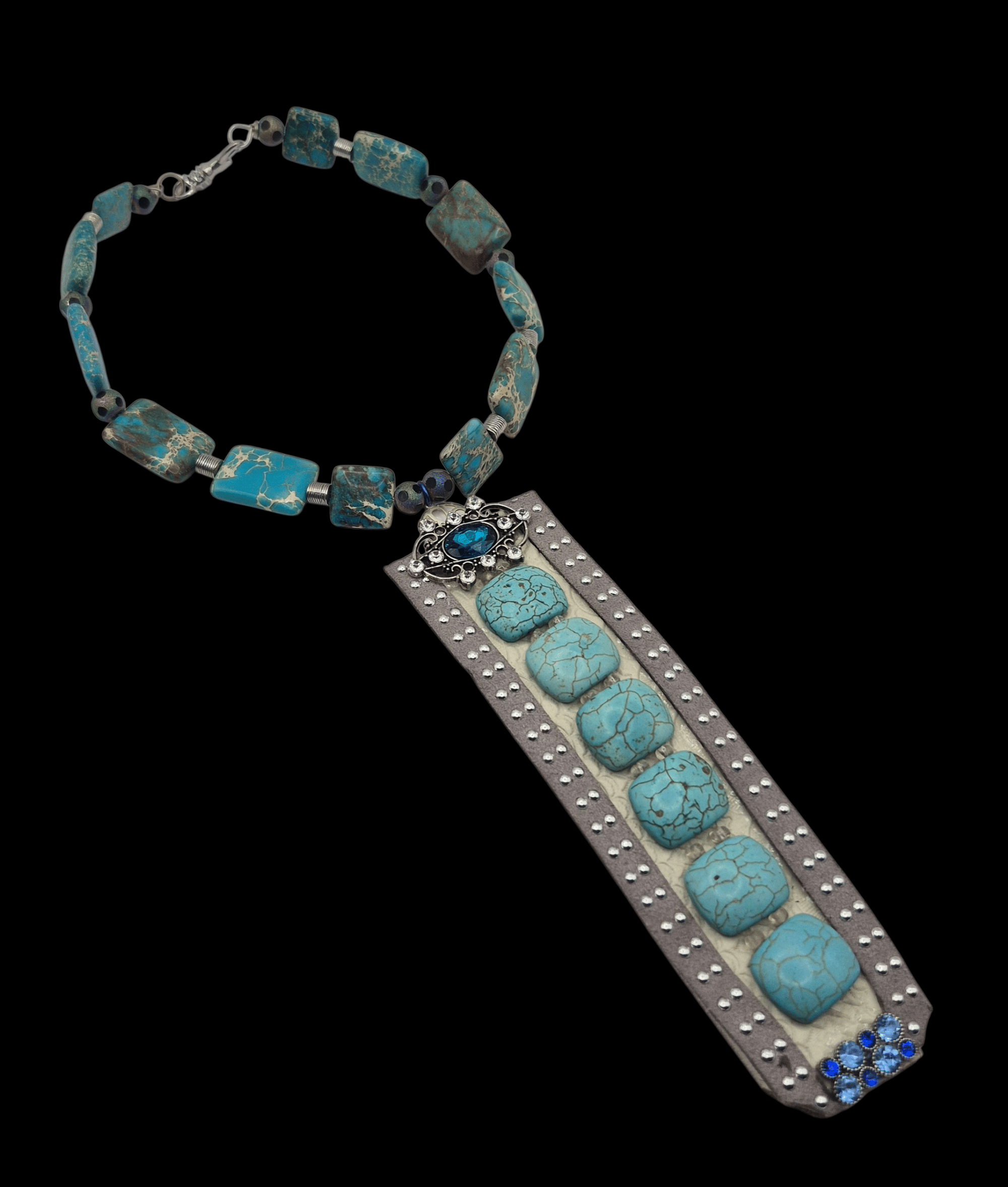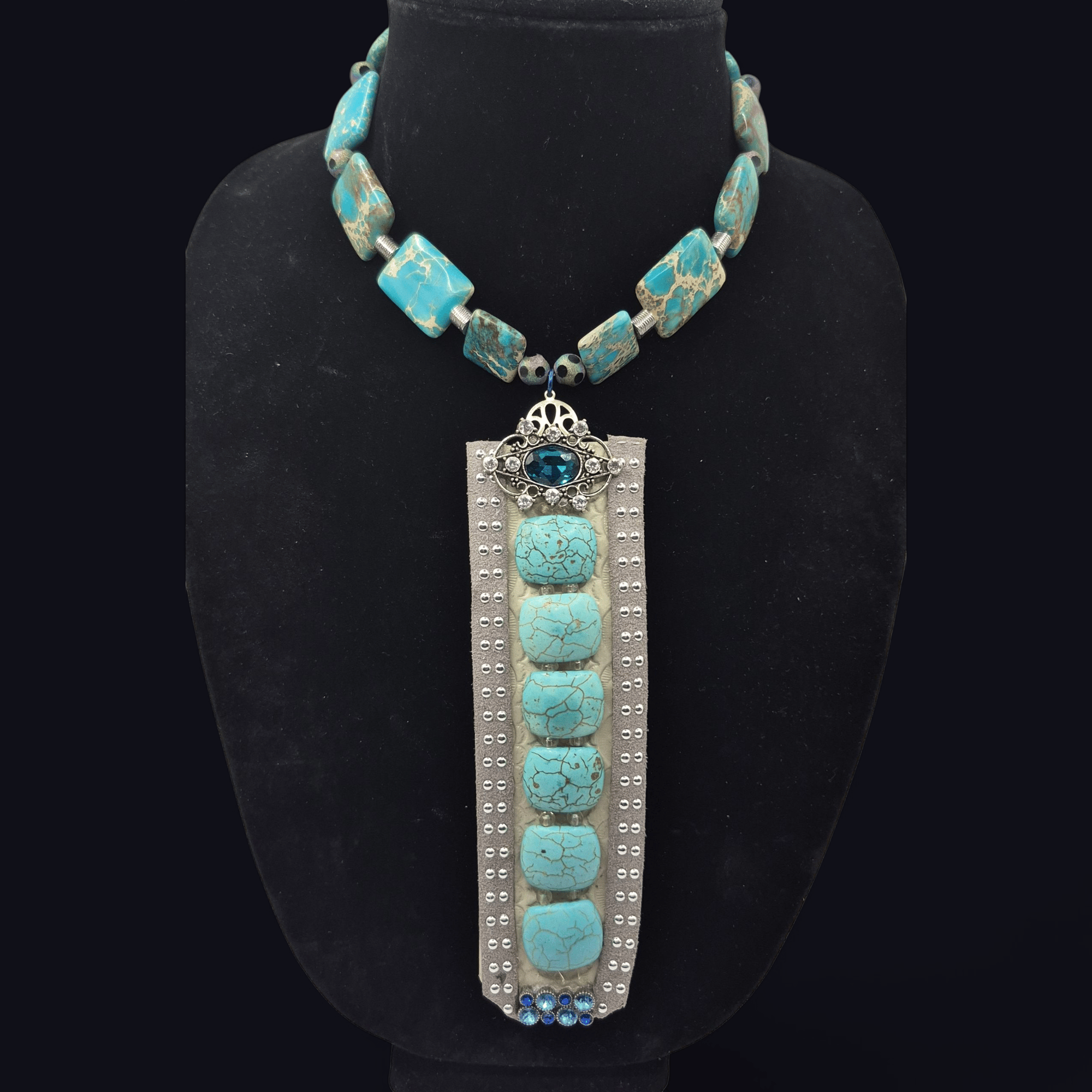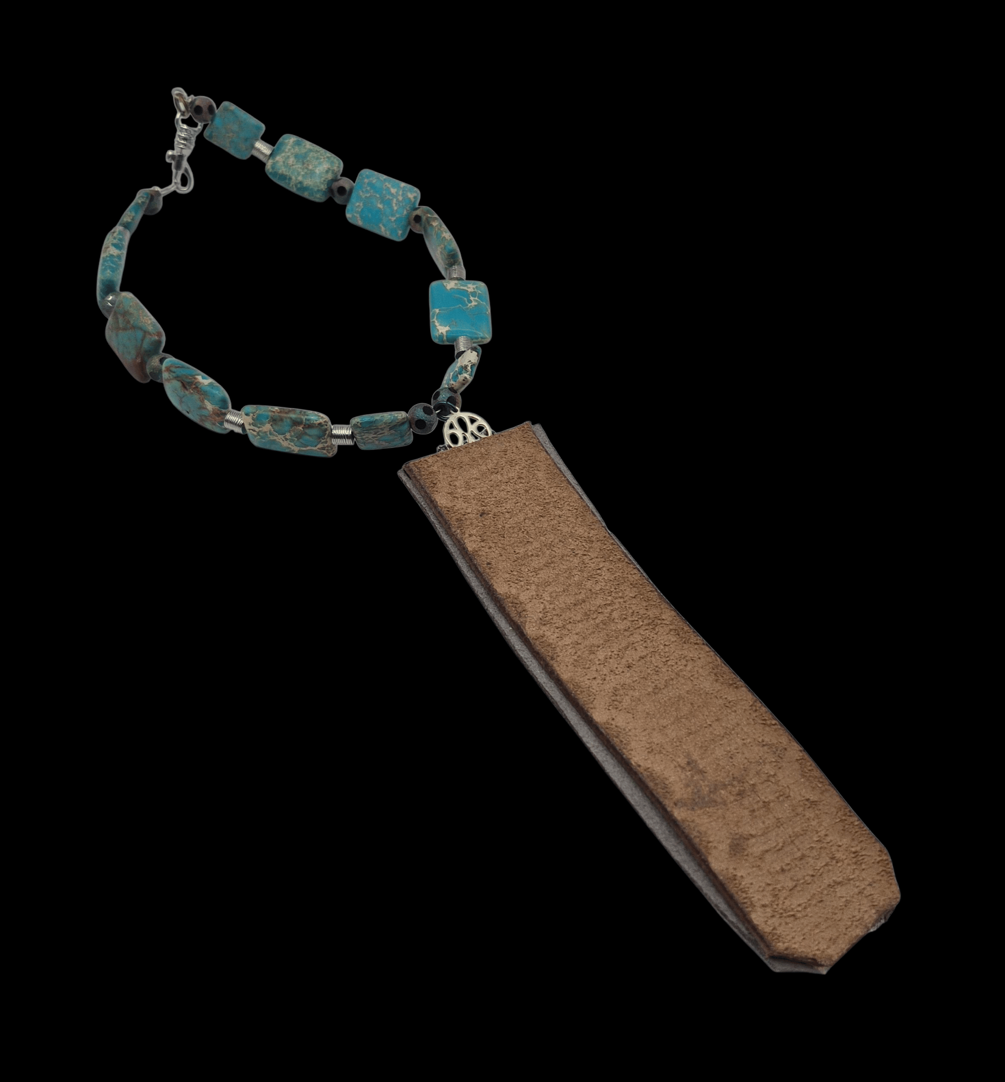 Item #200187 - 16 inch/6 inch (drop) - Leather flat with multi mix accent front, Turquoise flat stone paired with Iridescent filler accent back. Silver hook clasp.