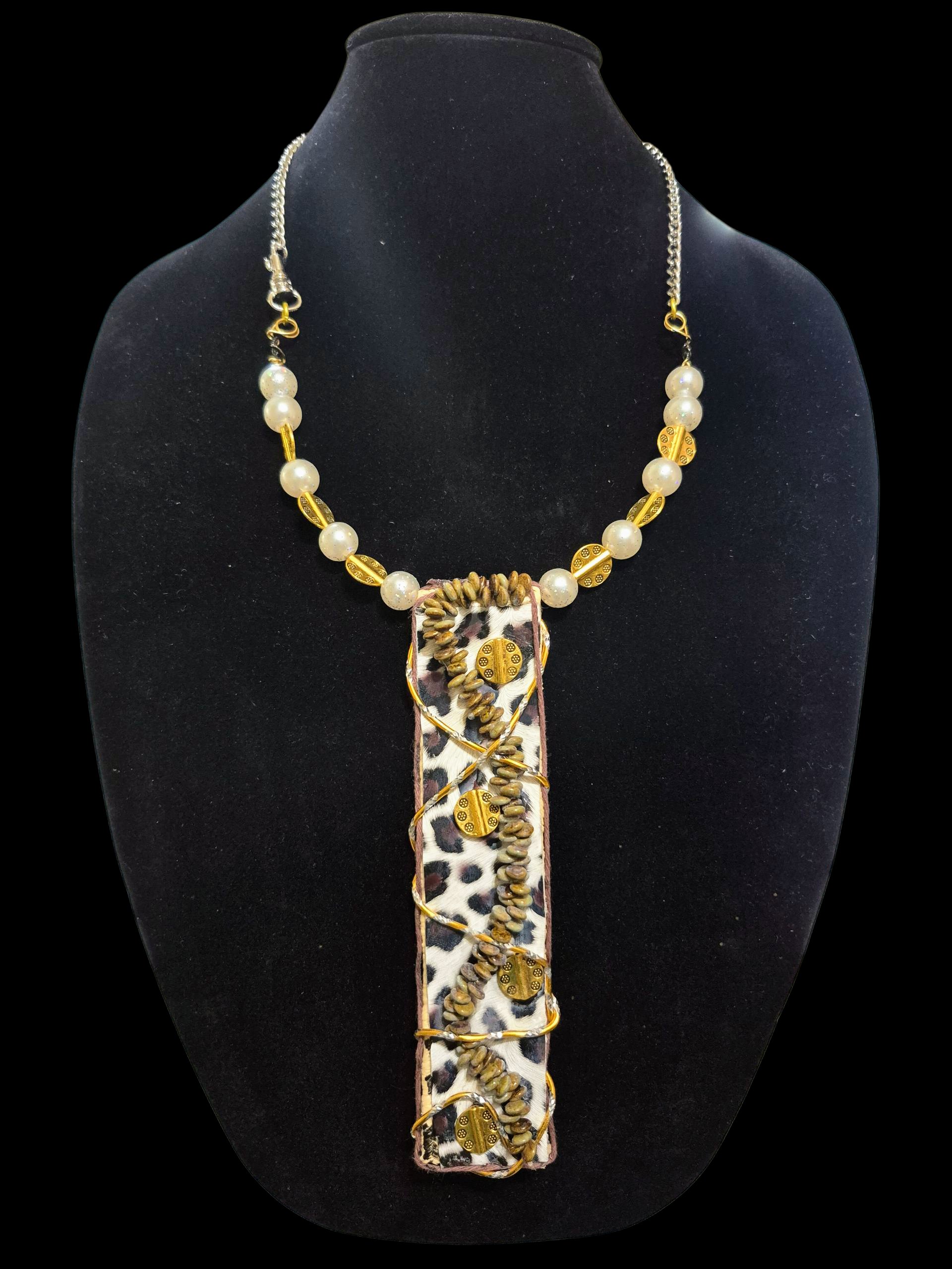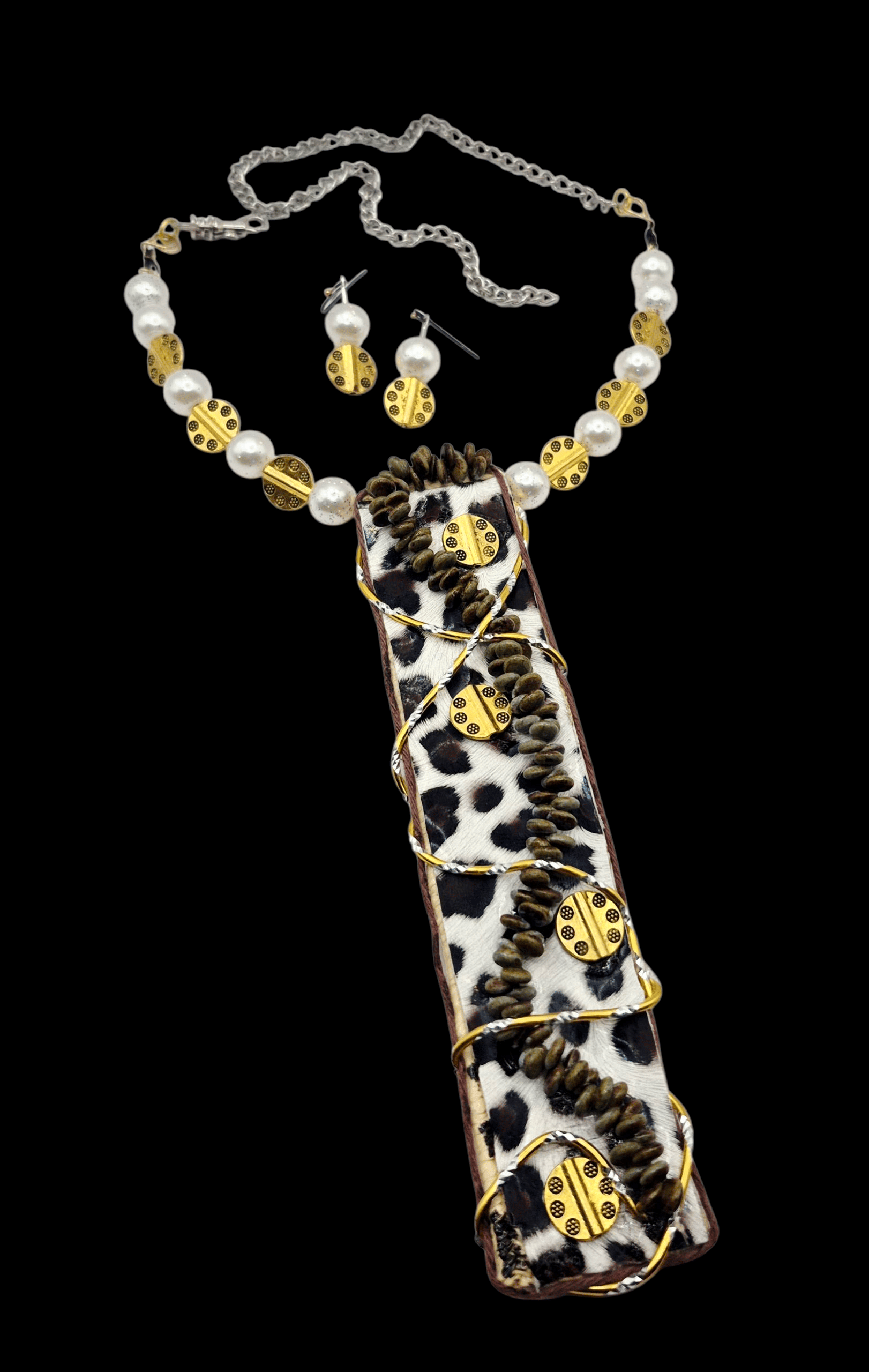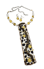 Item #200131 - 24 inch/7 inch (drop) - Leopard overlay, deco front, faceted gold wrap, sprinkle pearl paired with deco gold flat accent fillers. Silver back chain. Earrings on brush metal hooks.