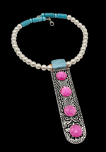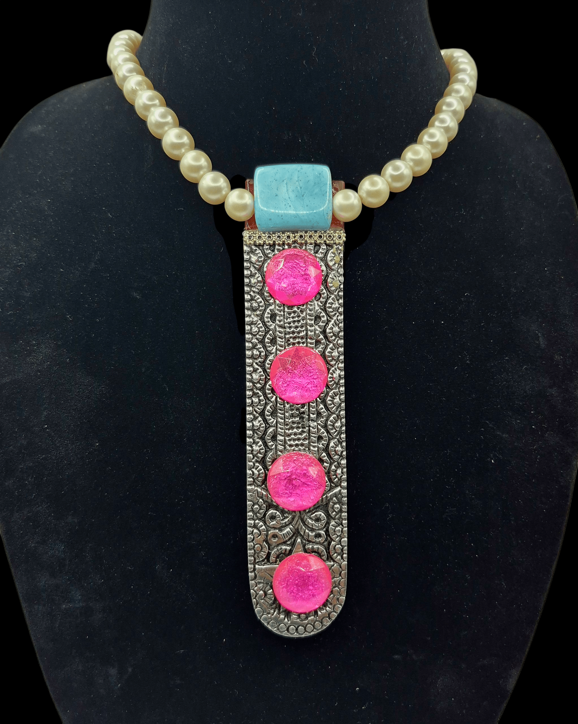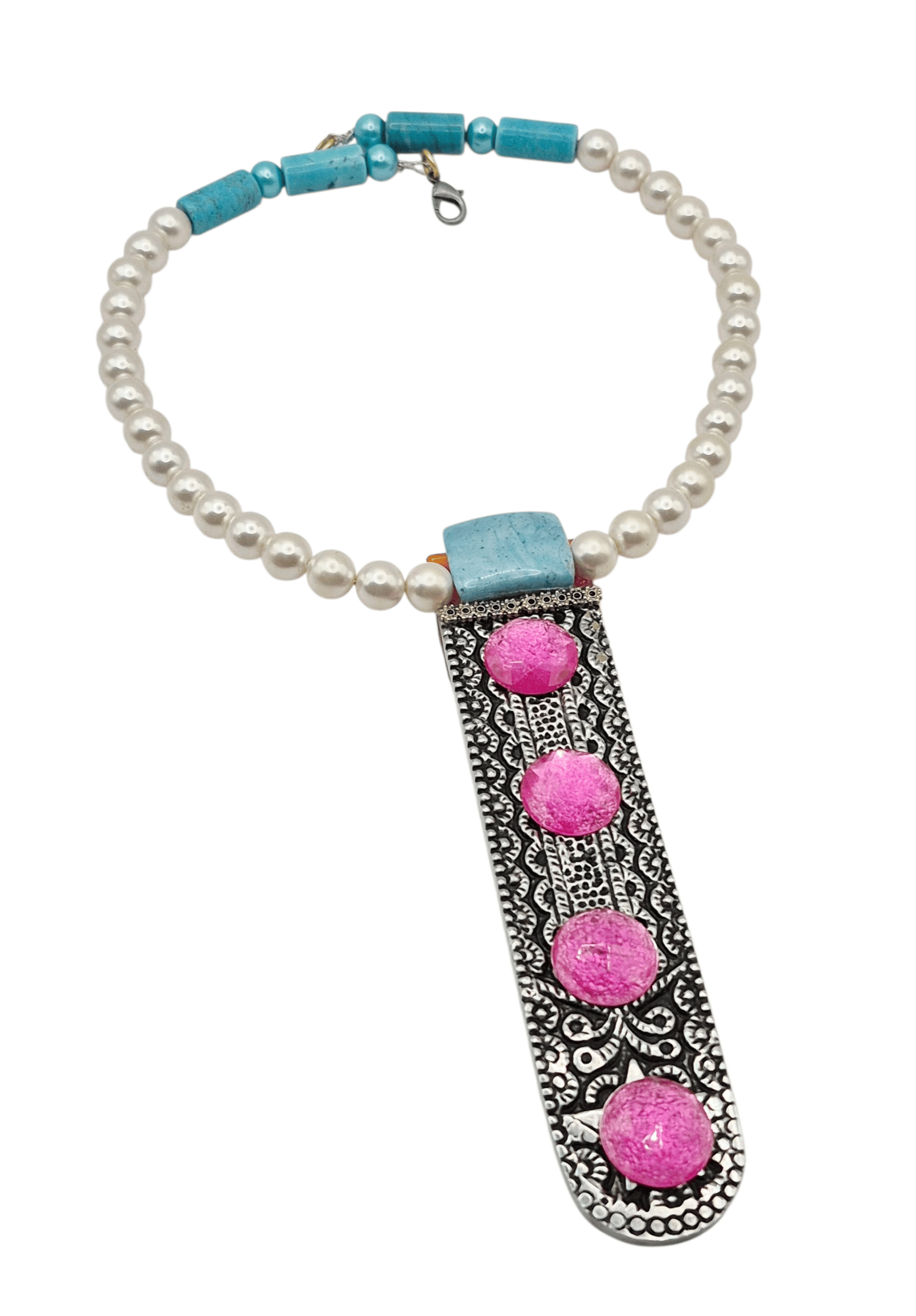 Item #958305 - 18 inch/5.5 inch (drop) - Silver deco metal back flat with resin burst accents, pearl and turquoise accent mix. Brush silver lobster claw clasp.