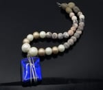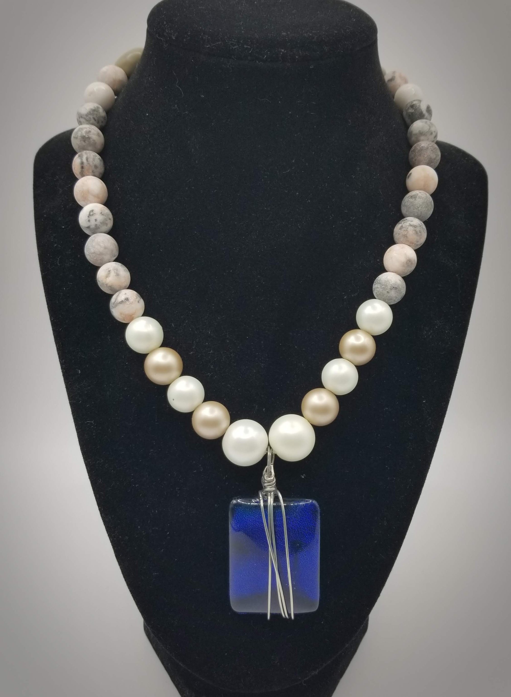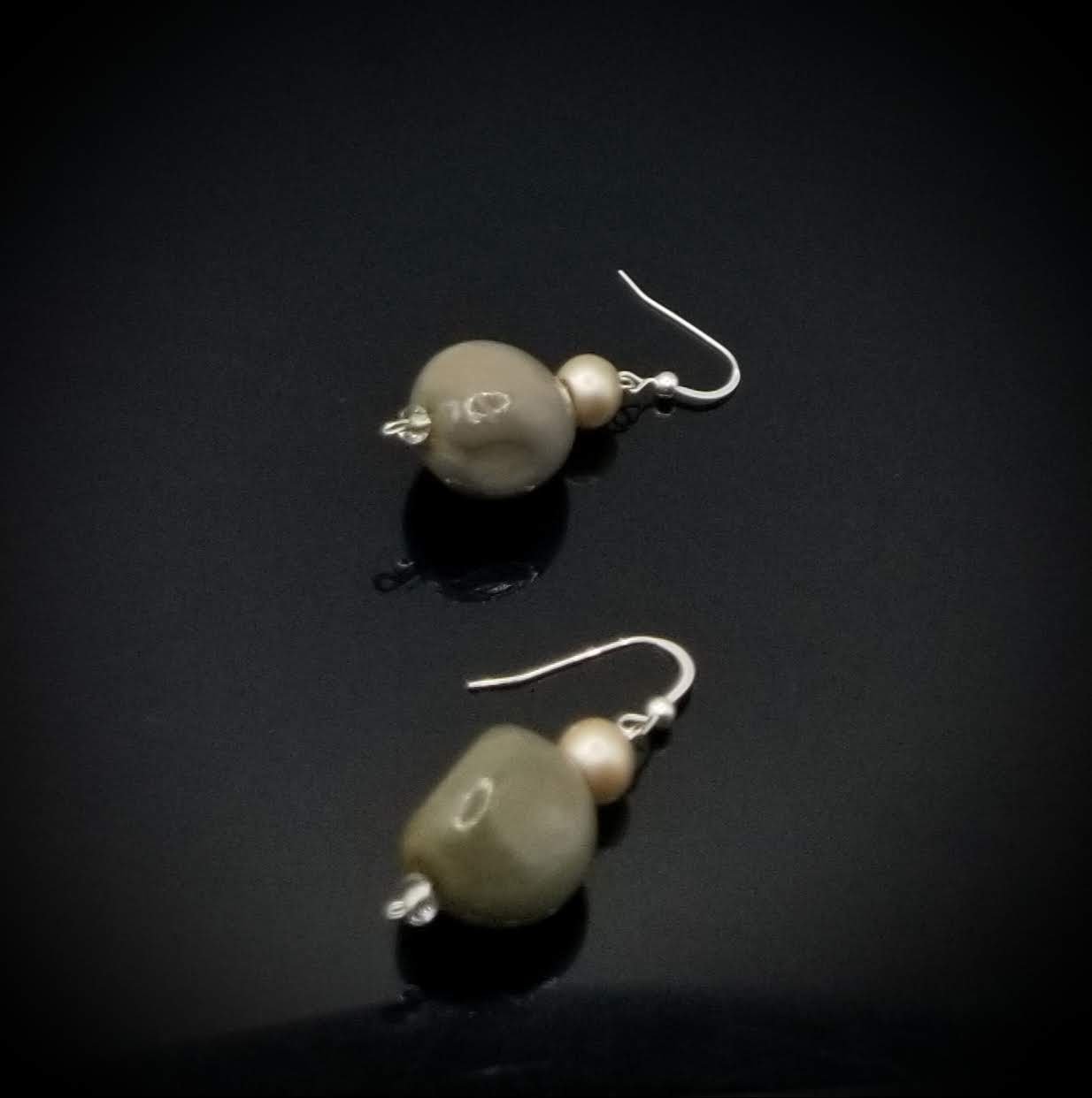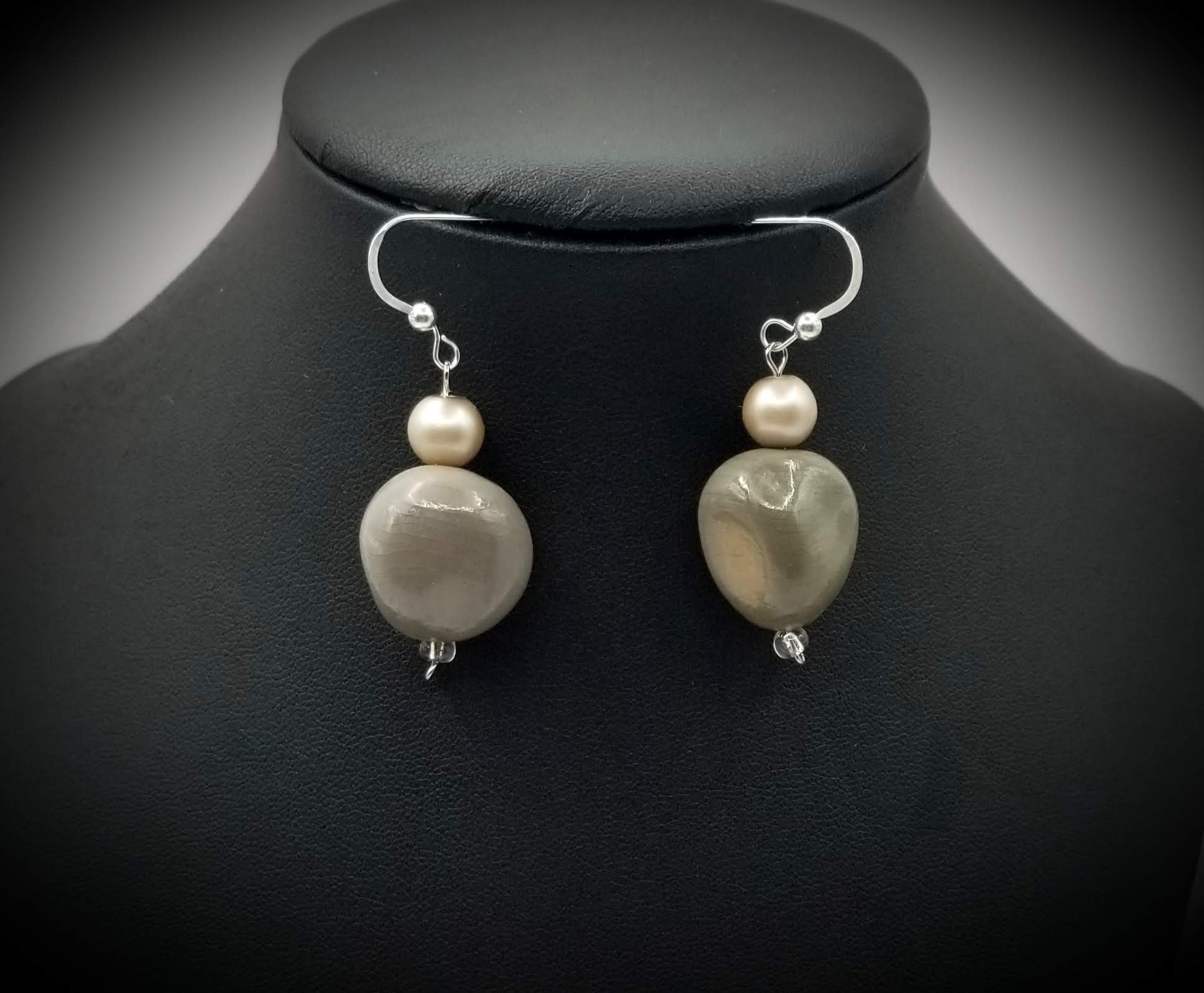 Item# 900177-17.5 inch Stone/Pearl mix paired with Ceramic puff nuggets back accents. Glass silver wire wrap contrast drop. Silver lobster claw. Earrings (ceramic nuggets) on Sterling silver flat hooks.