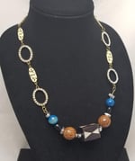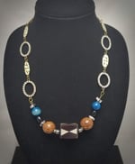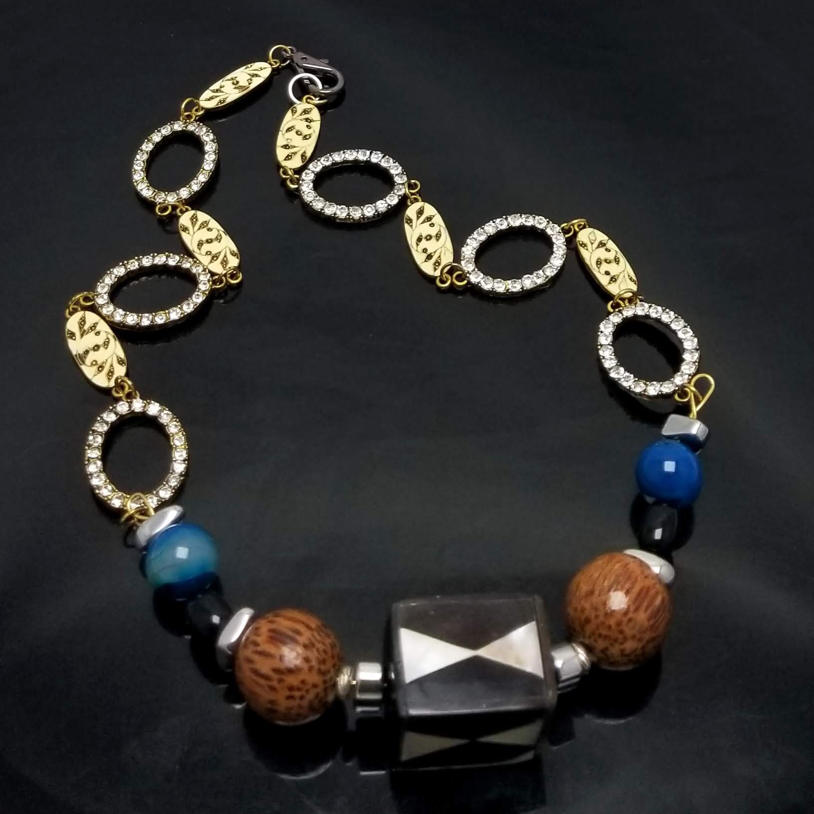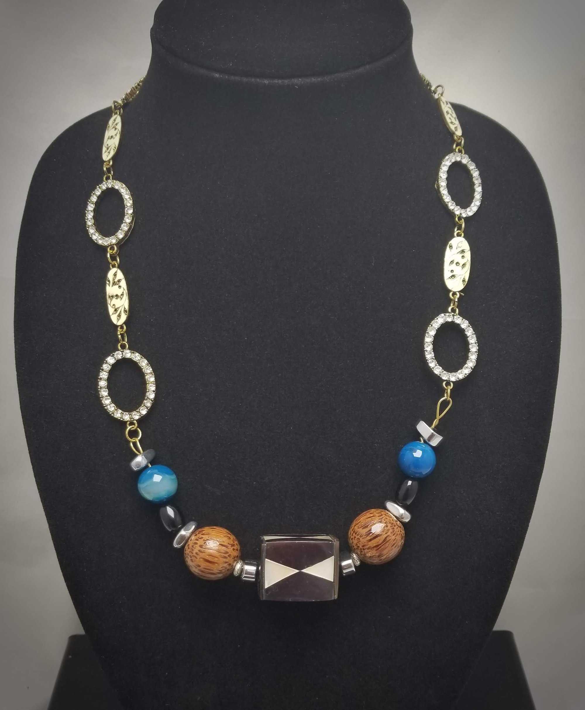 Item #806711-23.5 inch-Mixed element mix, open face metal stone accents, flats, wood, bead mix, jumbo checker front accent. Iridescent claw clasp.