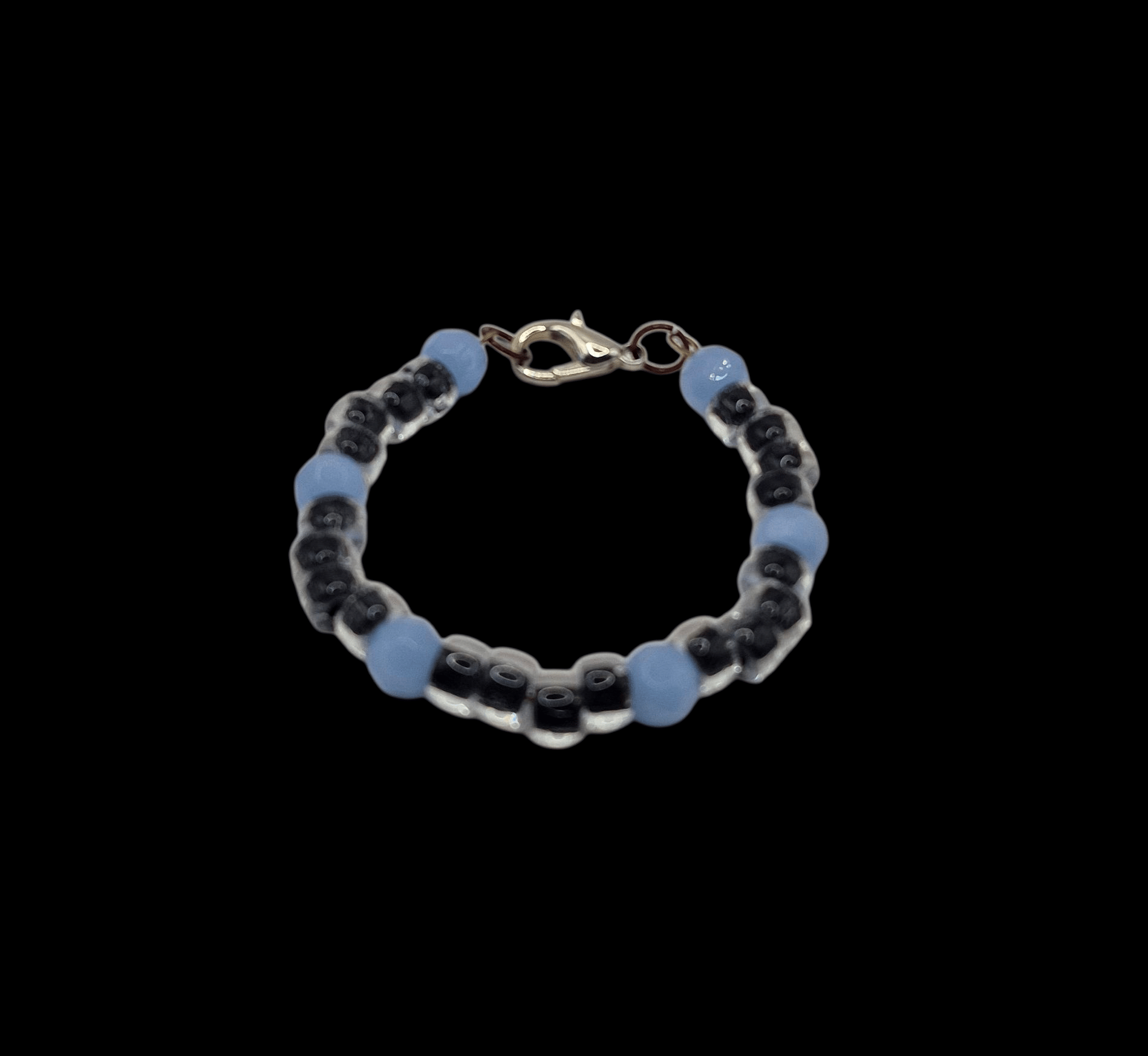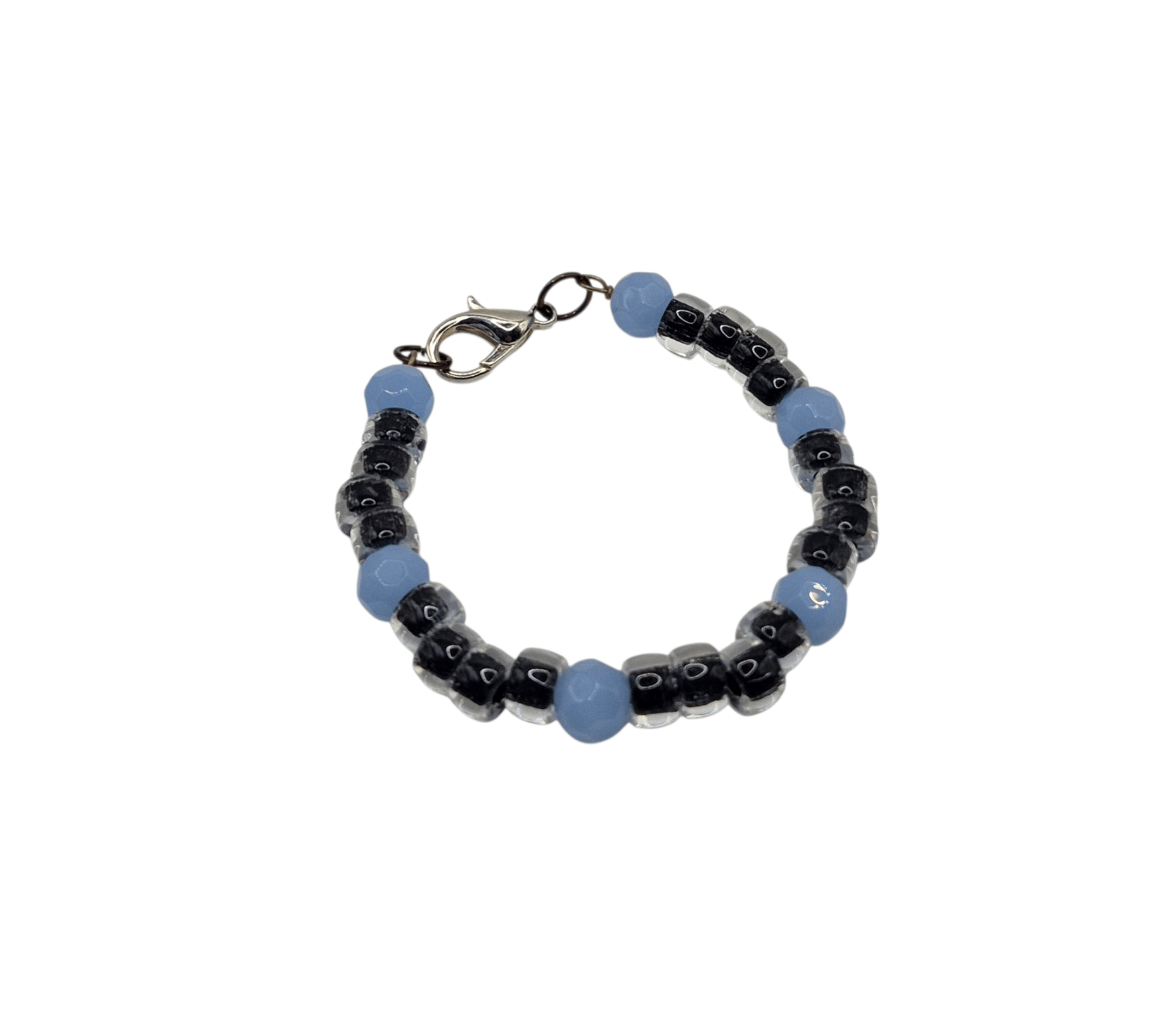 Item #912746 - 8 inch - Faceted slate glass accents paired with jet barrel glass. Silver lobster claw clasp.