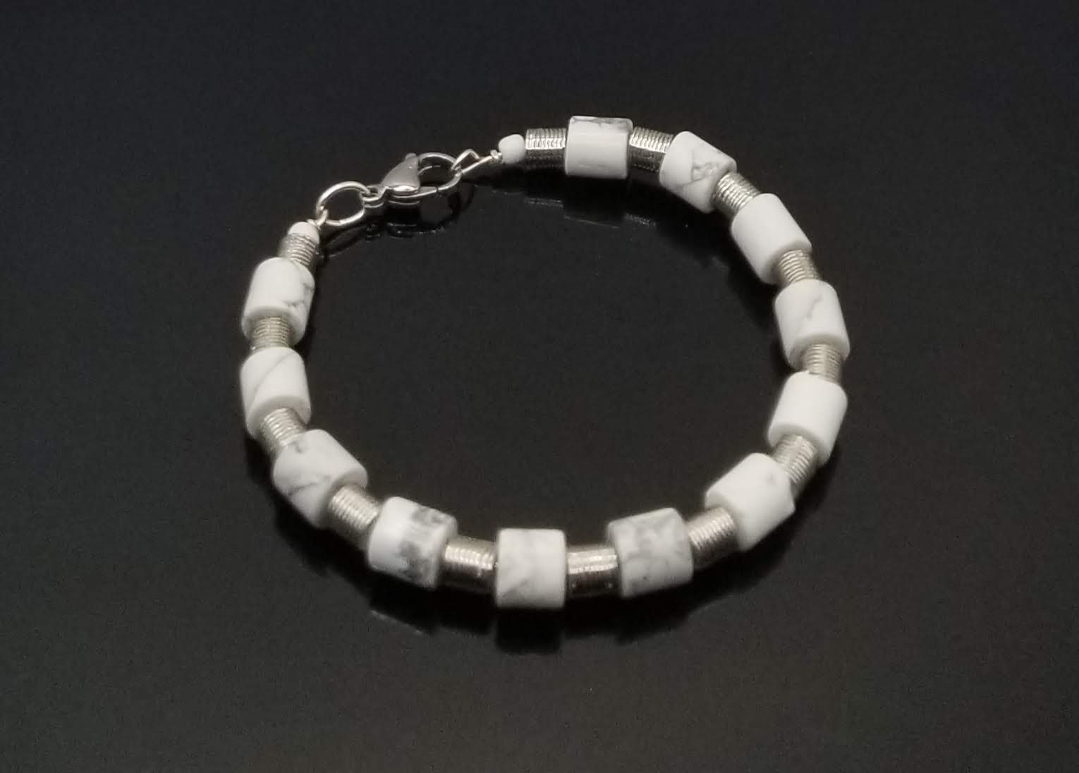 Item #900206- 8inch Flexi wire, surrounding Howlite bead paired with Silver deco accents. Silver lobster claw connect.