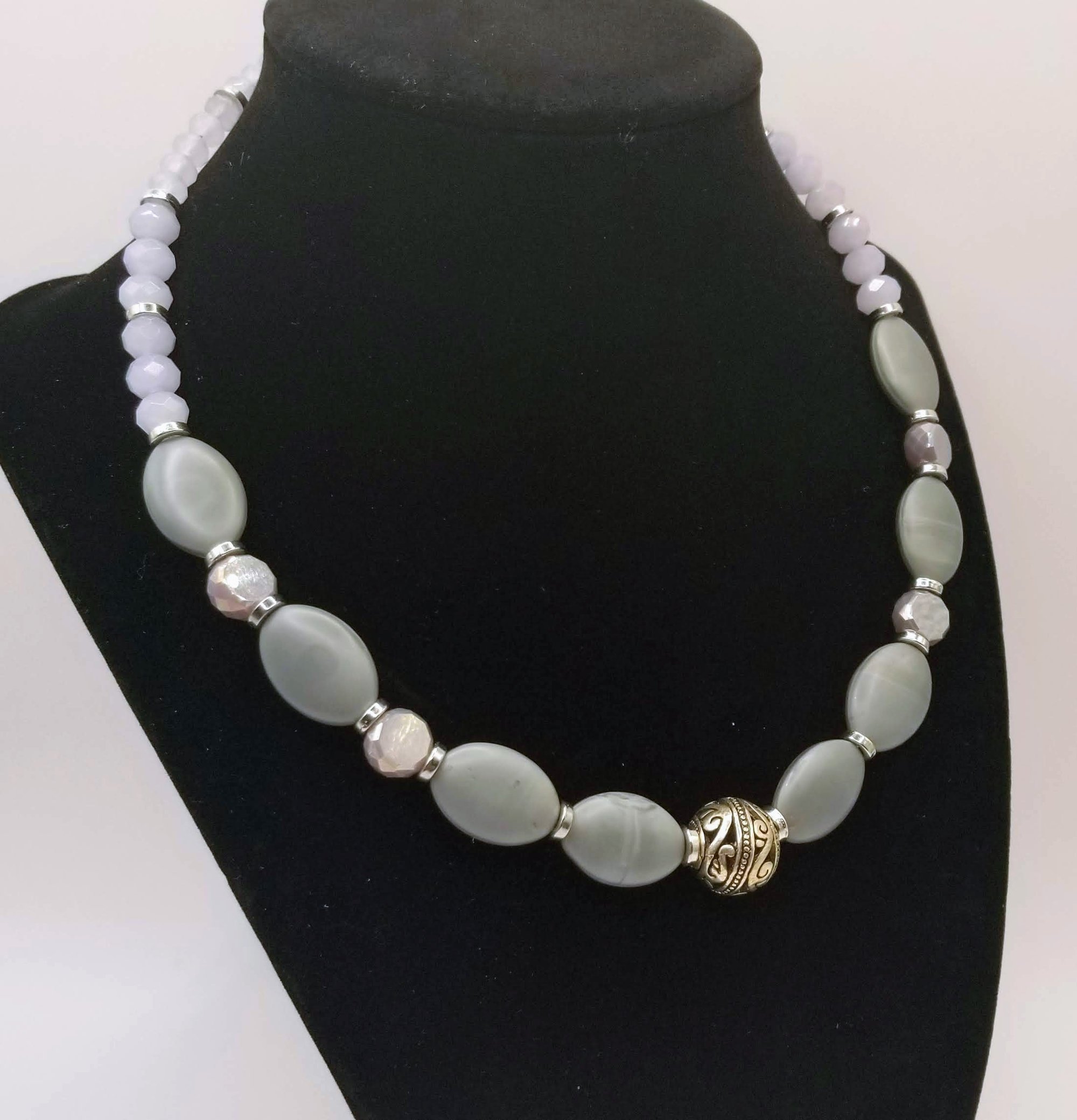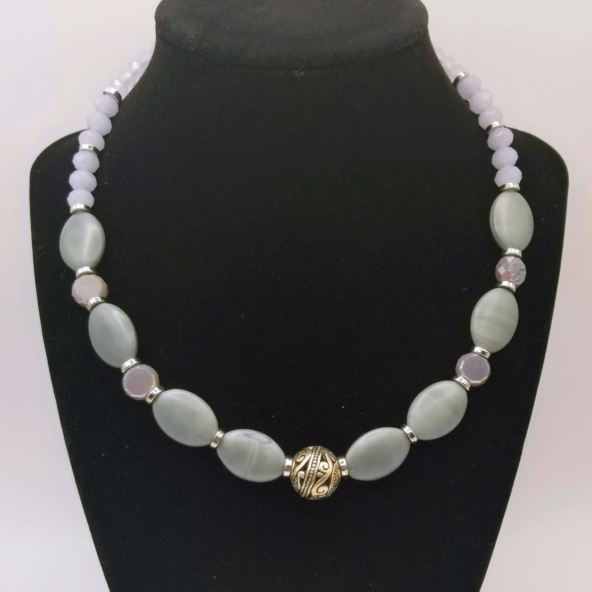 Item# 900896 - 17 inch- Stone flats with faceted glas mix. Frosted Rondella back accents. Silver lobster claw clasp.